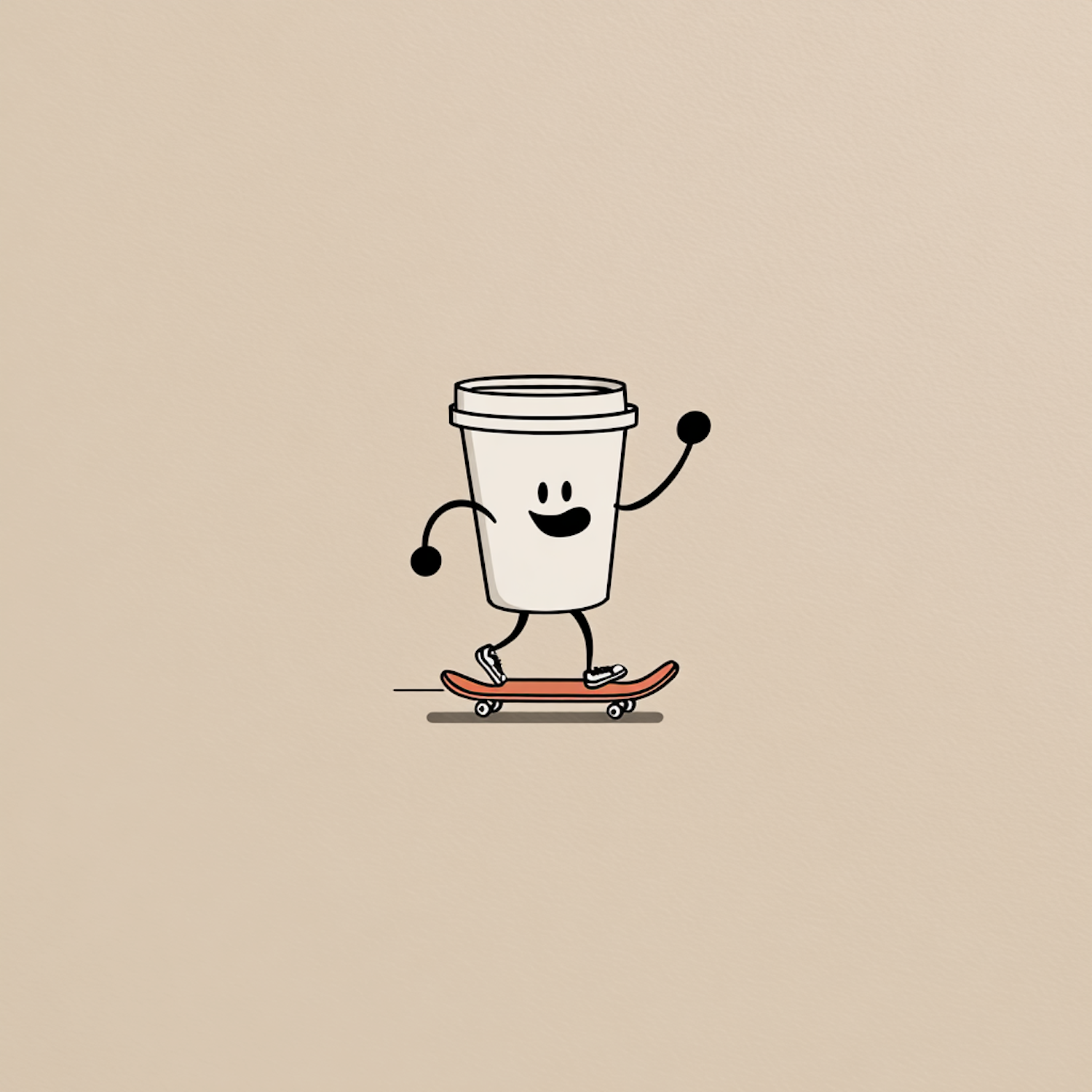 A cheerful coffee cup cartoon character rides a skateboard on a minimal light beige background, waving playfully and full of energy.