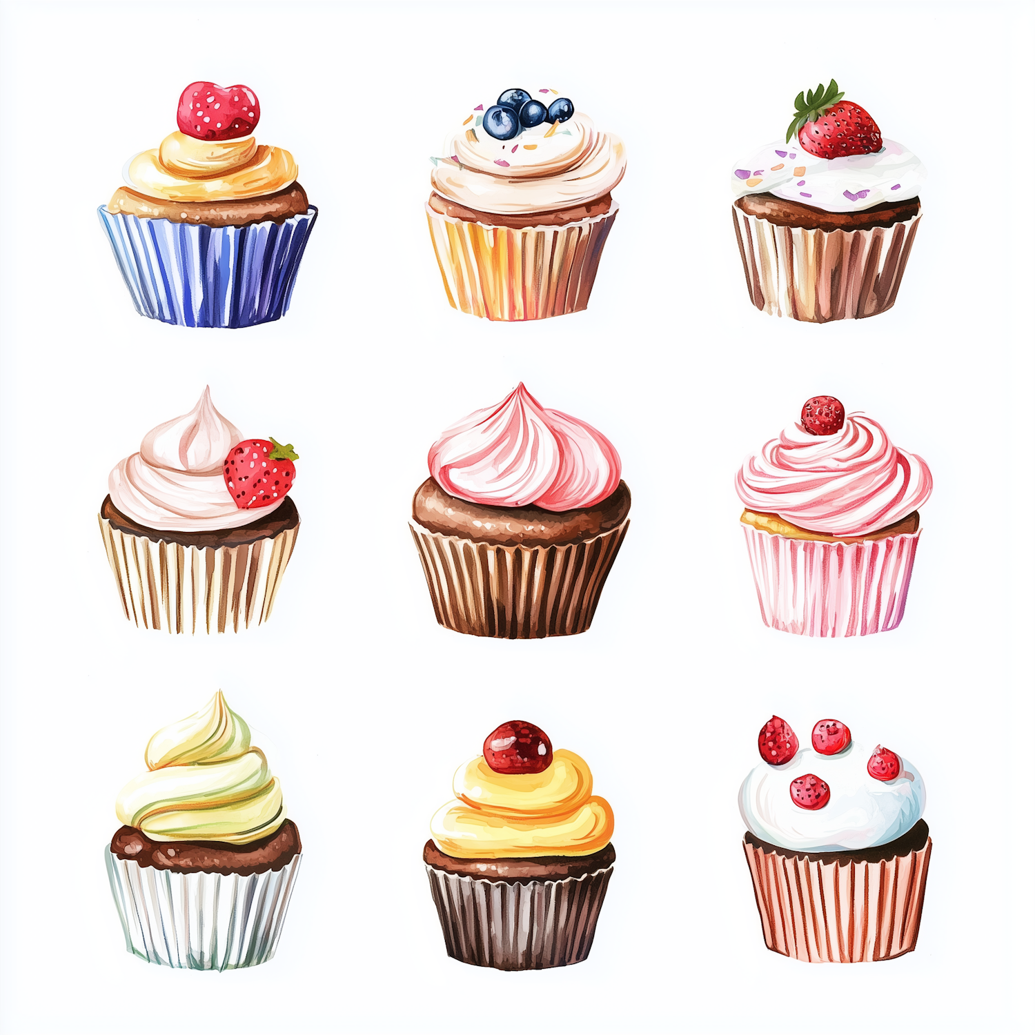 A delightful grid of nine colorful cupcakes with unique toppings like strawberries, blueberries, and swirled frosting. Perfect dessert inspiration!