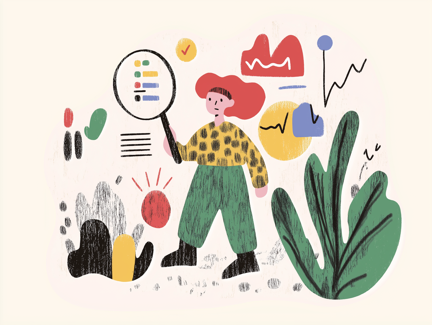 Whimsical illustration of a person analyzing colorful graphs with a magnifying glass, surrounded by abstract shapes and greenery.
