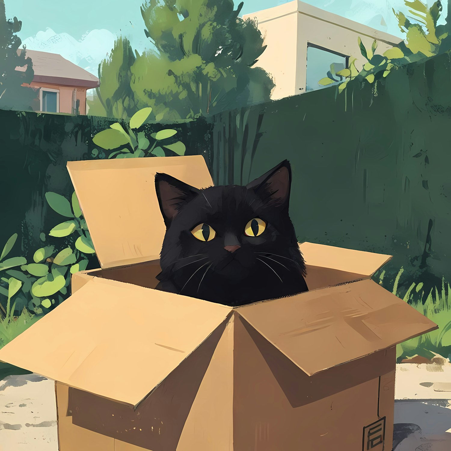 A black cat with yellow eyes peeks out of a cardboard box in a sunny garden, surrounded by lush greenery and a suburban house.