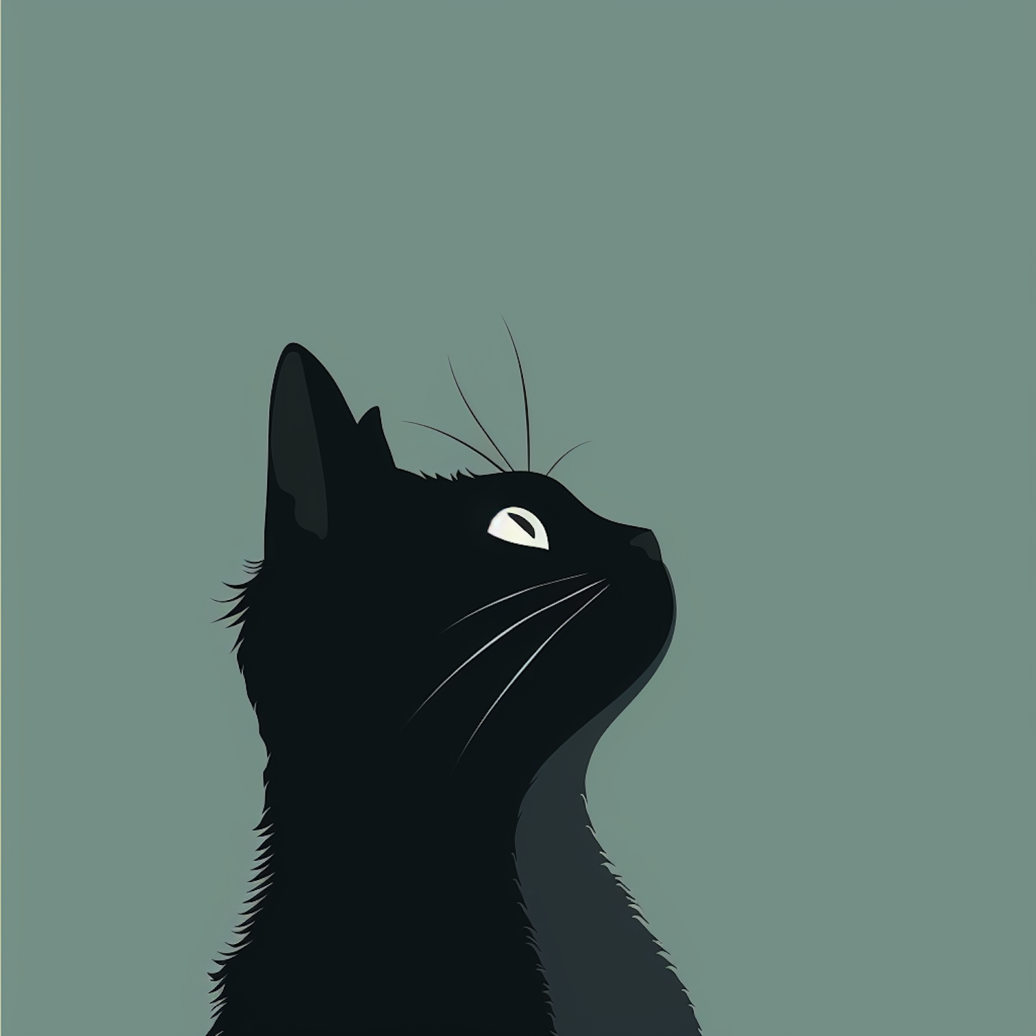 Minimalist illustration of a black cat in profile against a green background, highlighting its sleek fur and bright eyes.