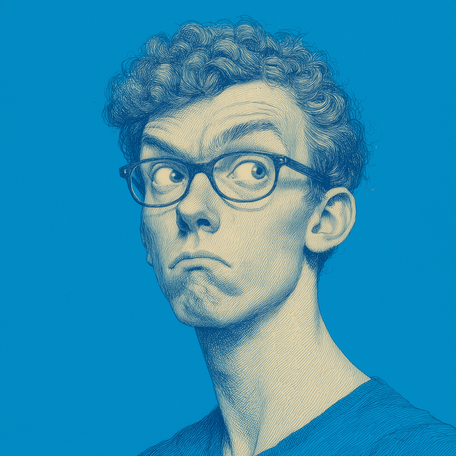 Stylized blue-toned illustration of a person with glasses and curly hair, looking sideways with a curious expression.