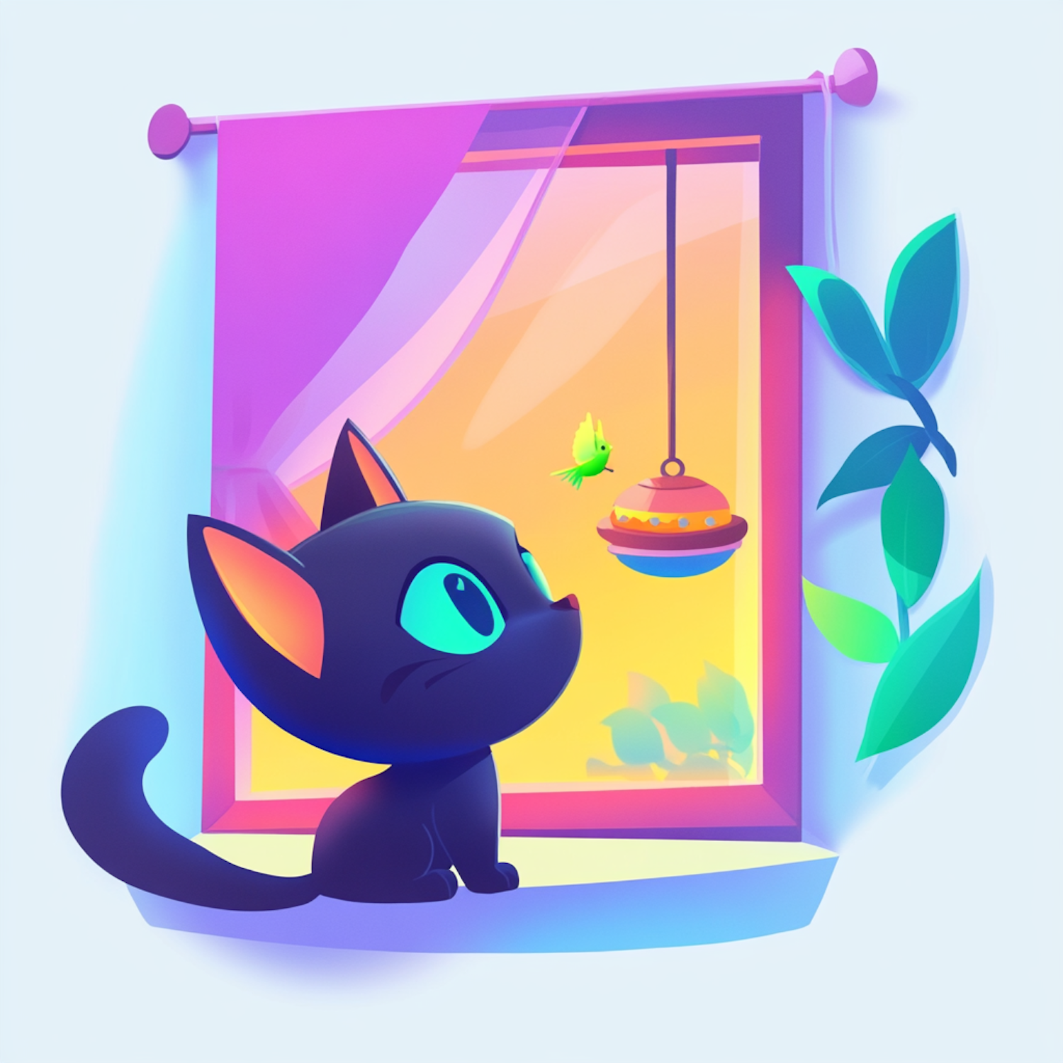 A cute black cat with blue eyes watches a green bird by a colorful window. Vibrant illustration with playful colors.