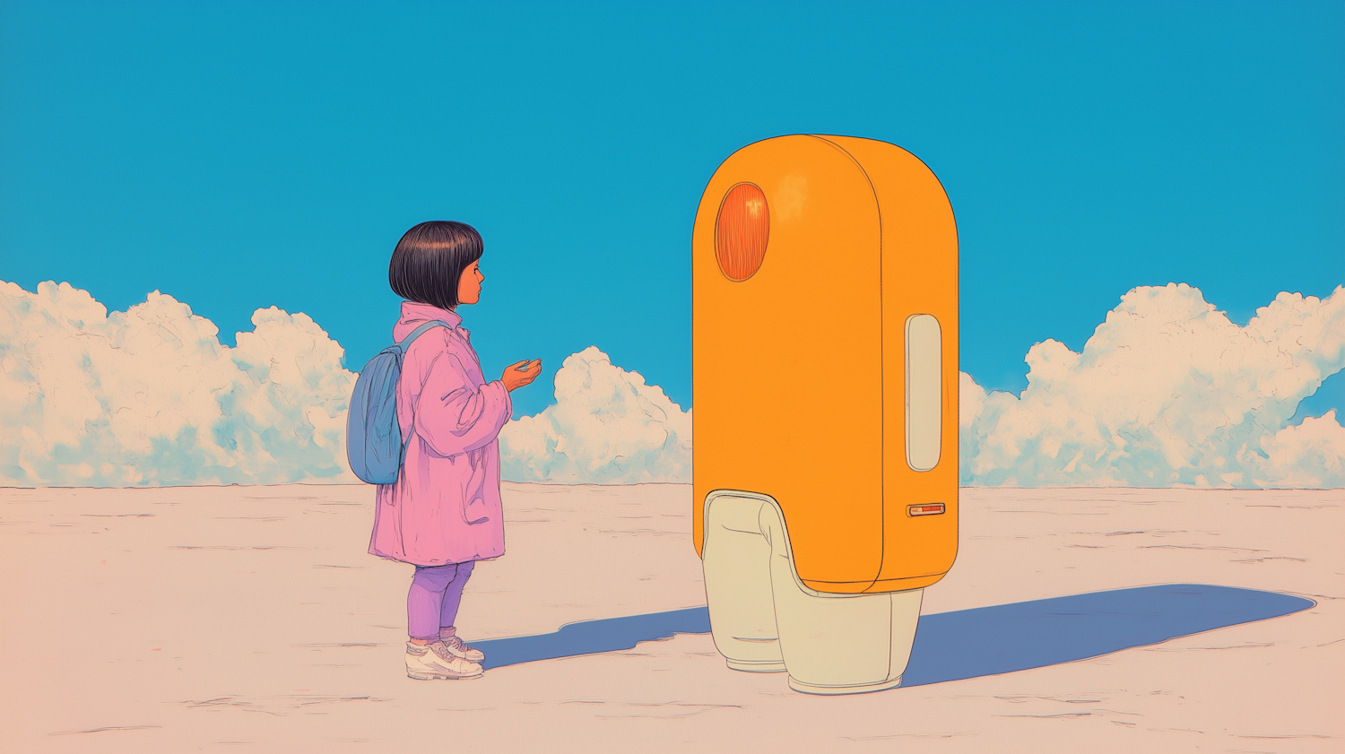 A young girl in a purple coat interacts with a large orange object under a clear blue sky with clouds.