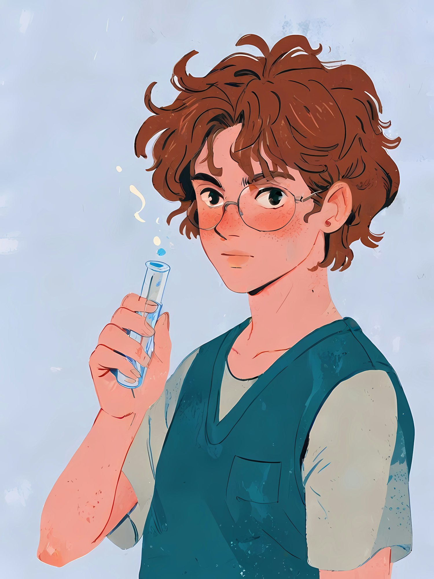 Illustration of a young person with curly hair and glasses holding a bubbling test tube, set against a soft blue background.