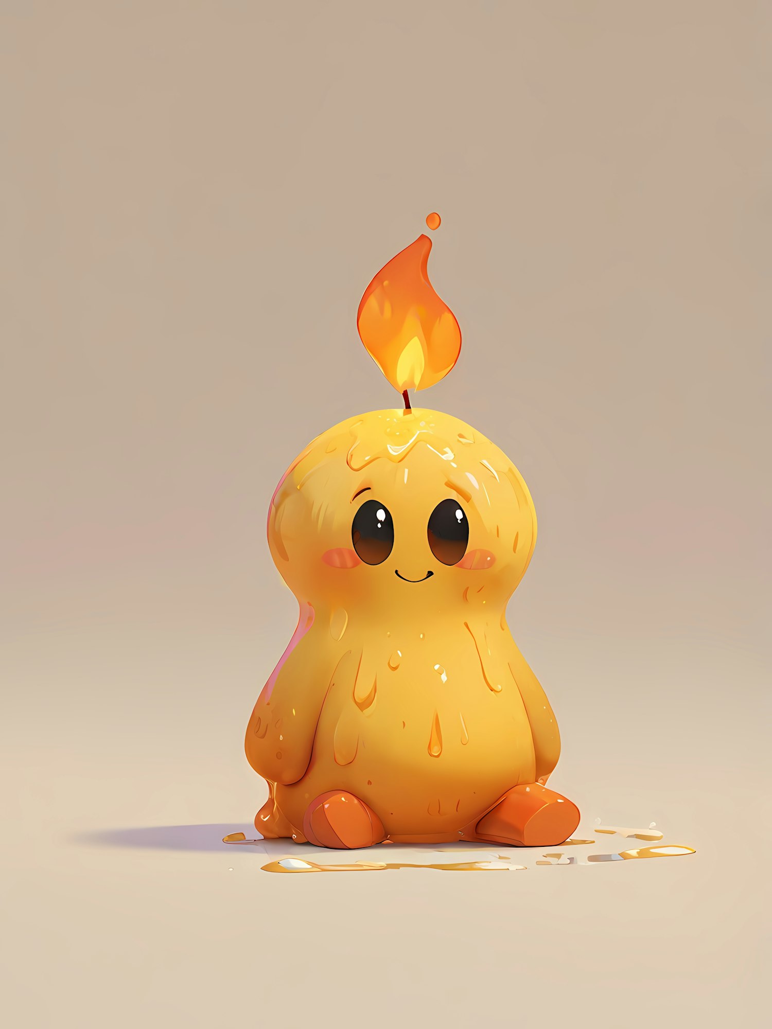 Adorable 3D candle character with a melting wax body, big eyes, and a flickering flame on its head. Perfect for whimsical and cozy vibes.