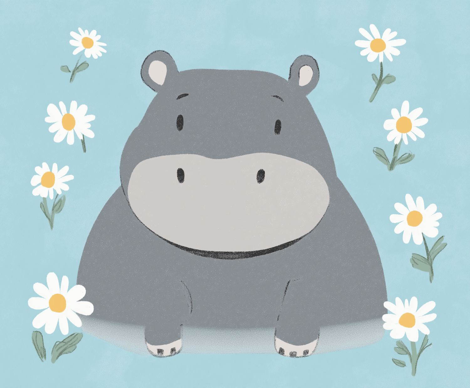 Adorable cartoon hippo surrounded by daisies on a pastel blue background, perfect for children's decor or playful designs.