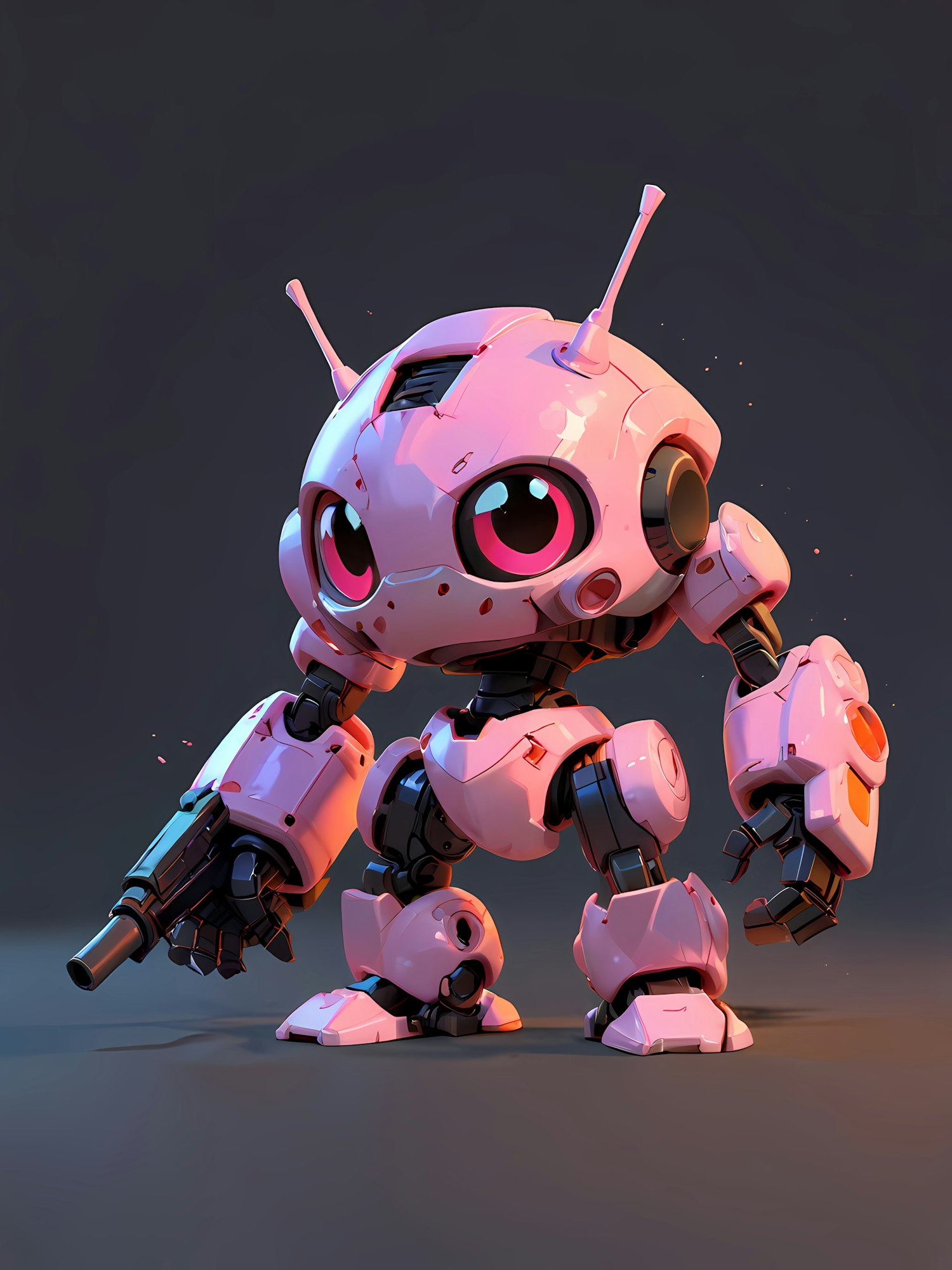 Adorable pink robot with big eyes, antennae, and a futuristic weapon, blending cute and sci-fi vibes in a sleek 3D design.