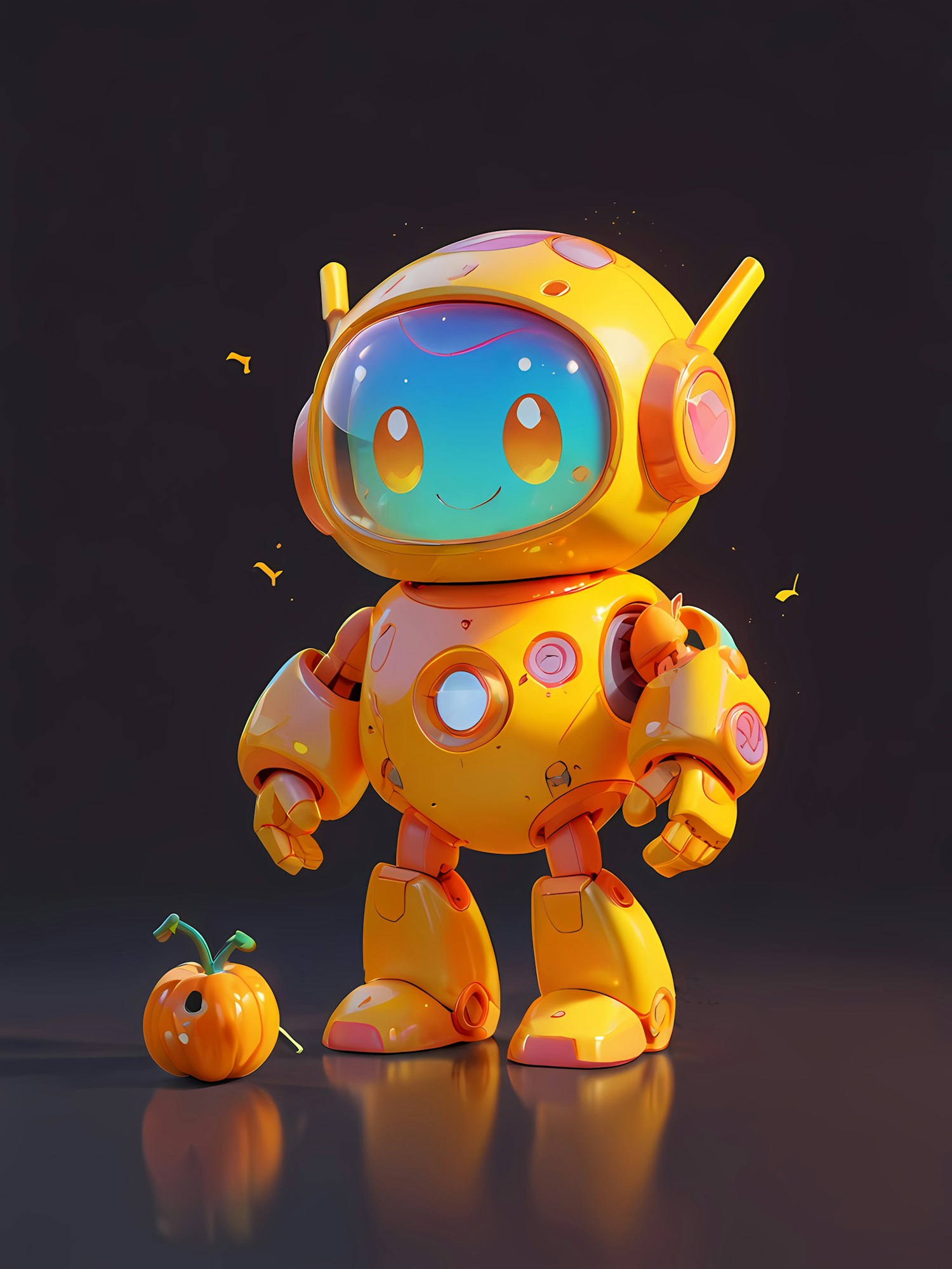 Adorable 3D robot in yellow-orange hues with a glowing blue face, standing next to a tiny pumpkin on a dark reflective surface.
