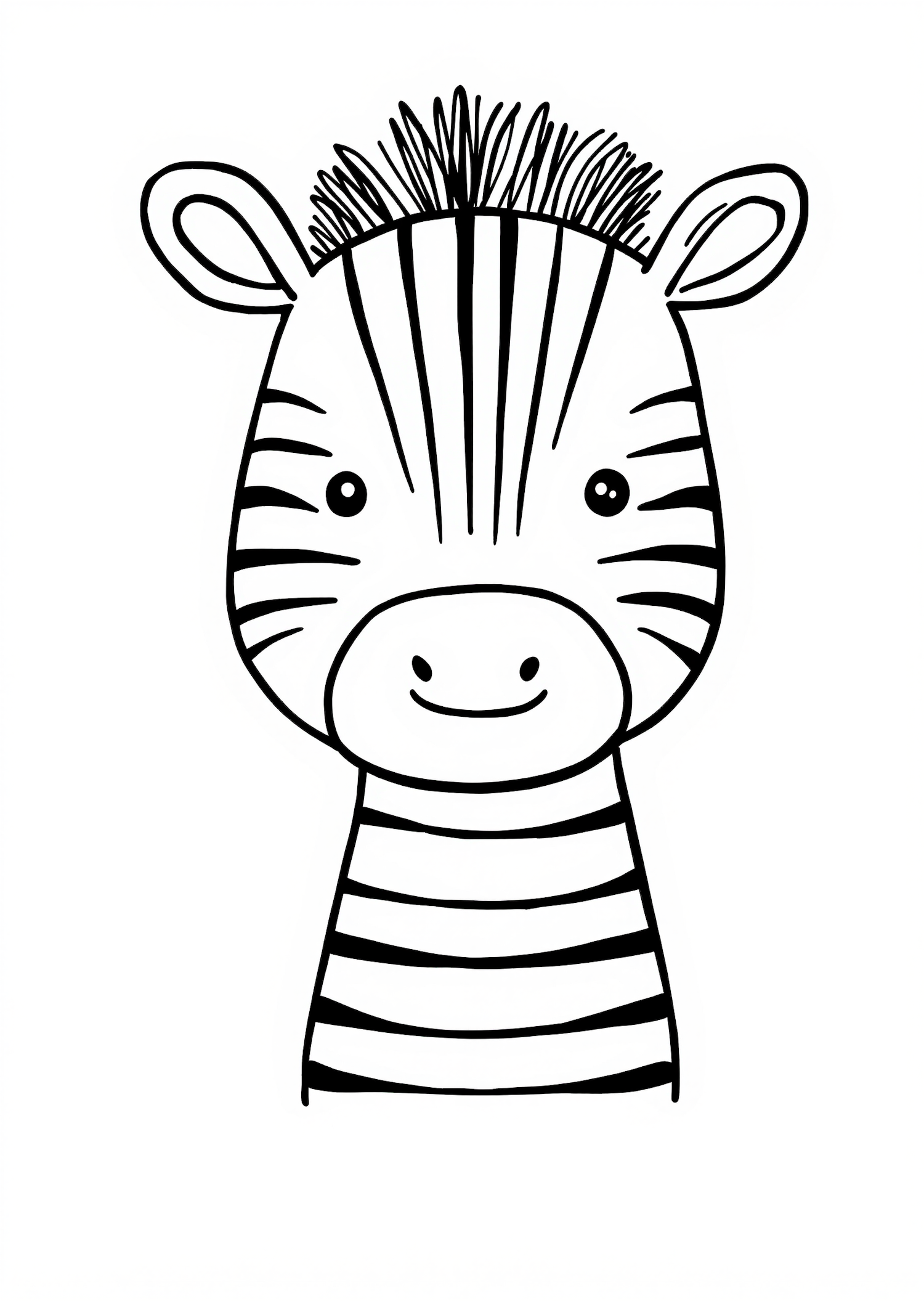 Adorable black-and-white illustration of a smiling zebra with a spiky mane and bold stripes, perfect for kids' coloring or decor.