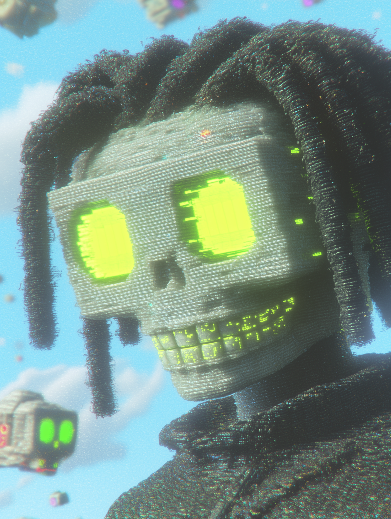 A pixelated humanoid figure with glowing green eyes and dreadlocks in a surreal, futuristic setting with floating cubes and a bright sky.