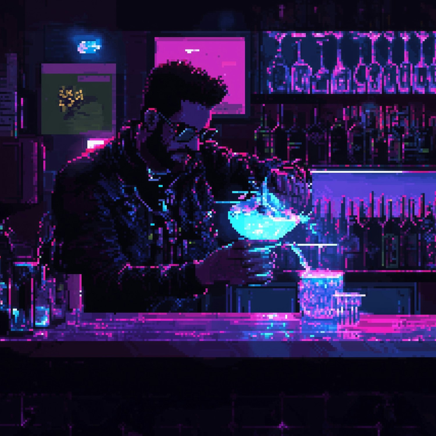 Pixel art of a bartender in a neon-lit bar pouring a glowing blue drink, surrounded by vibrant pink and blue cyberpunk lighting.