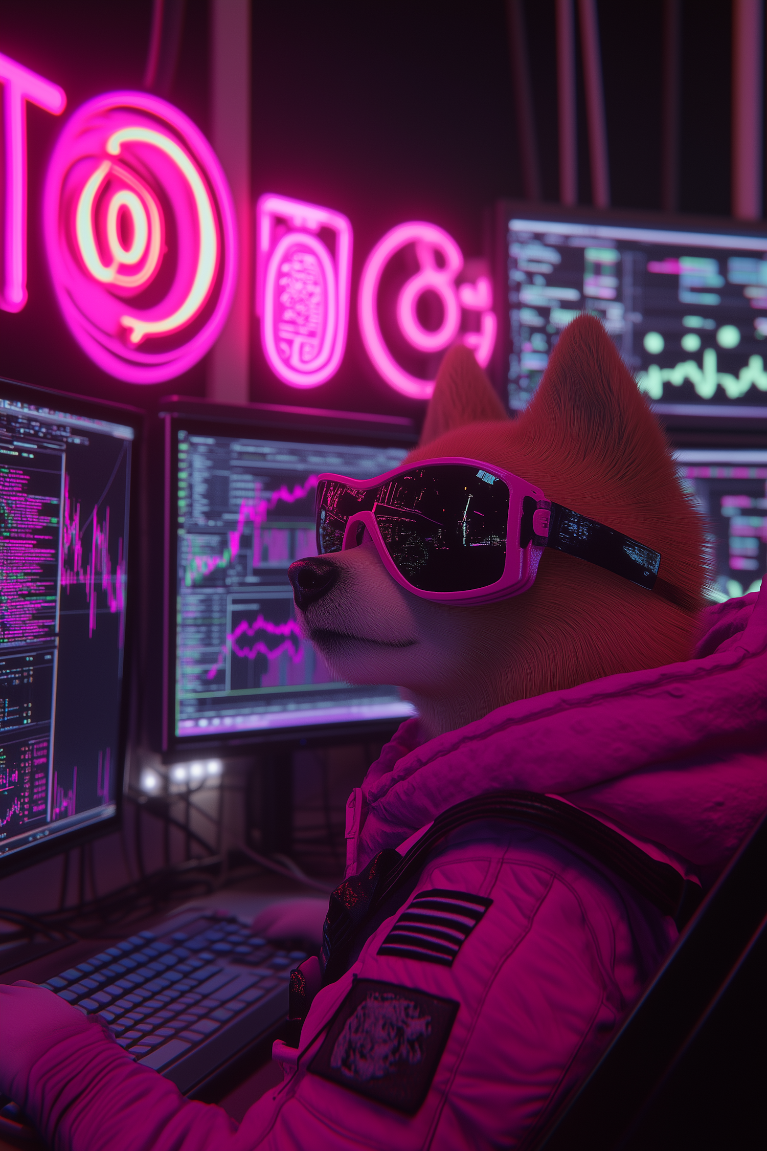 Shiba Inu in sunglasses at a computer desk with neon lights and data screens, creating a cyberpunk tech vibe.