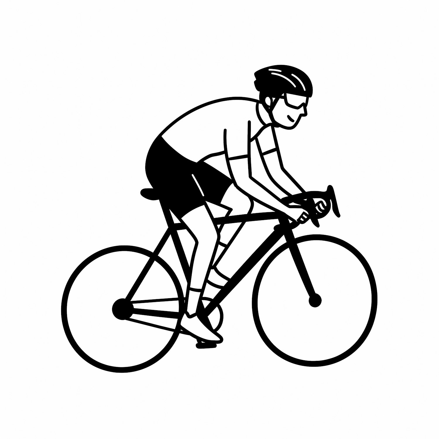 Minimalist black-and-white illustration of a cyclist on a road bike, wearing a helmet and sunglasses, in a dynamic side profile view.