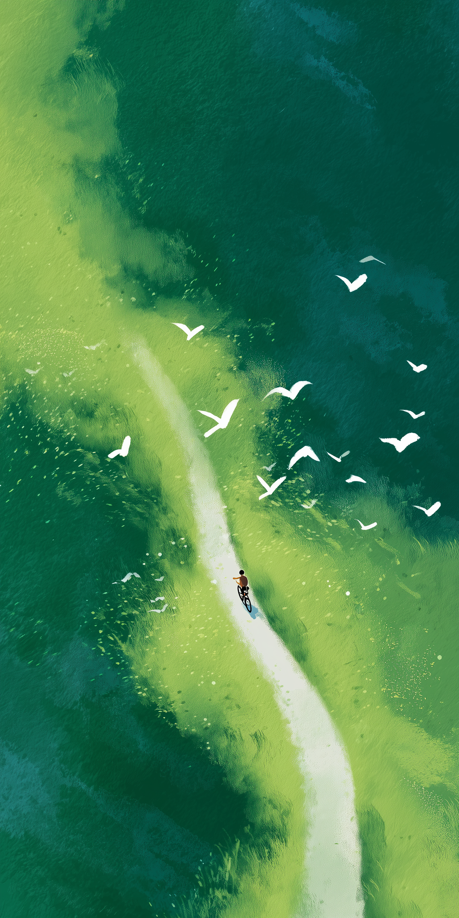 A cyclist rides along a winding path through lush green fields, surrounded by flying white birds in this serene and vibrant illustration.