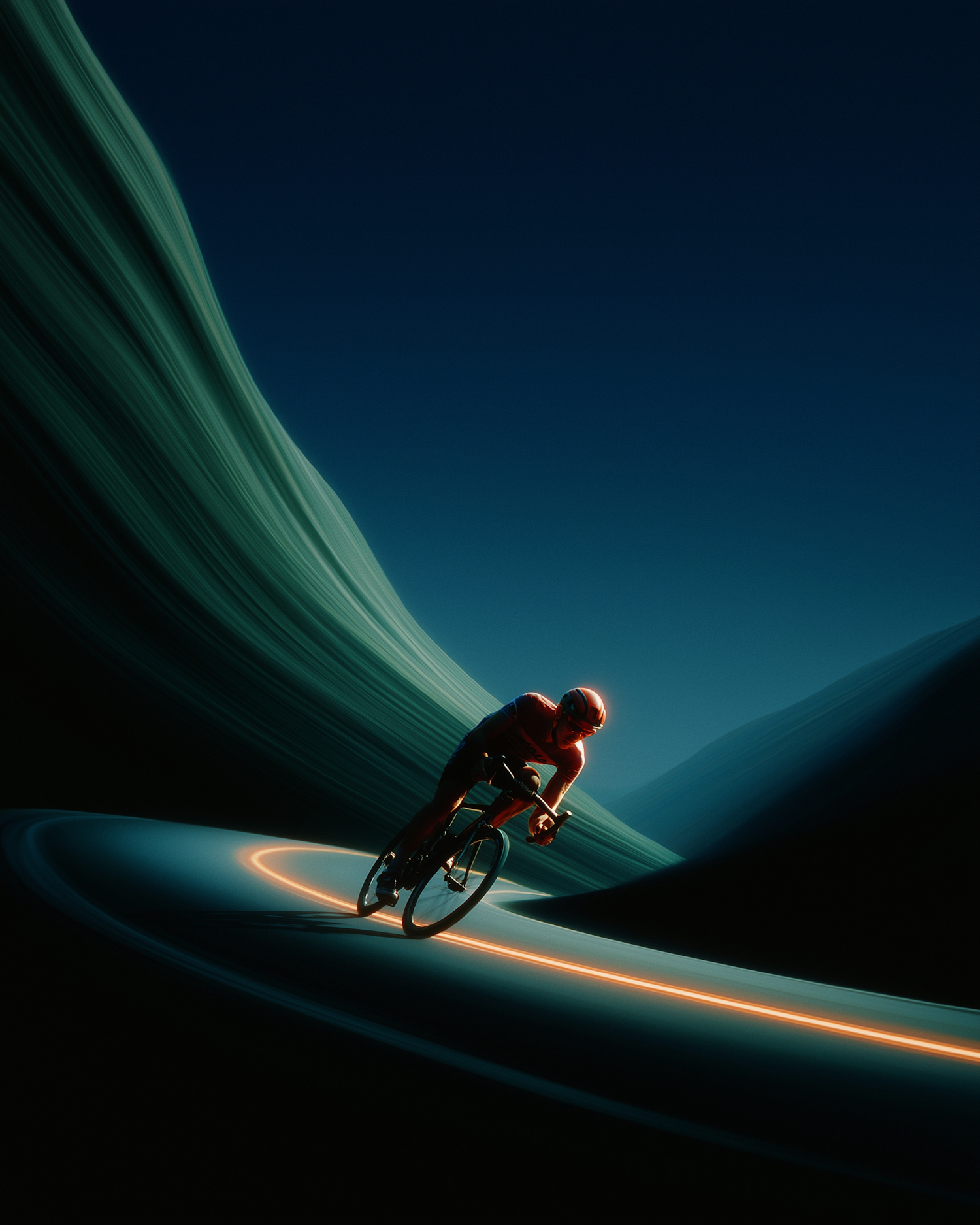 A cyclist rides on a glowing path through a surreal, dark landscape with flowing hills, creating a dynamic and futuristic atmosphere.
