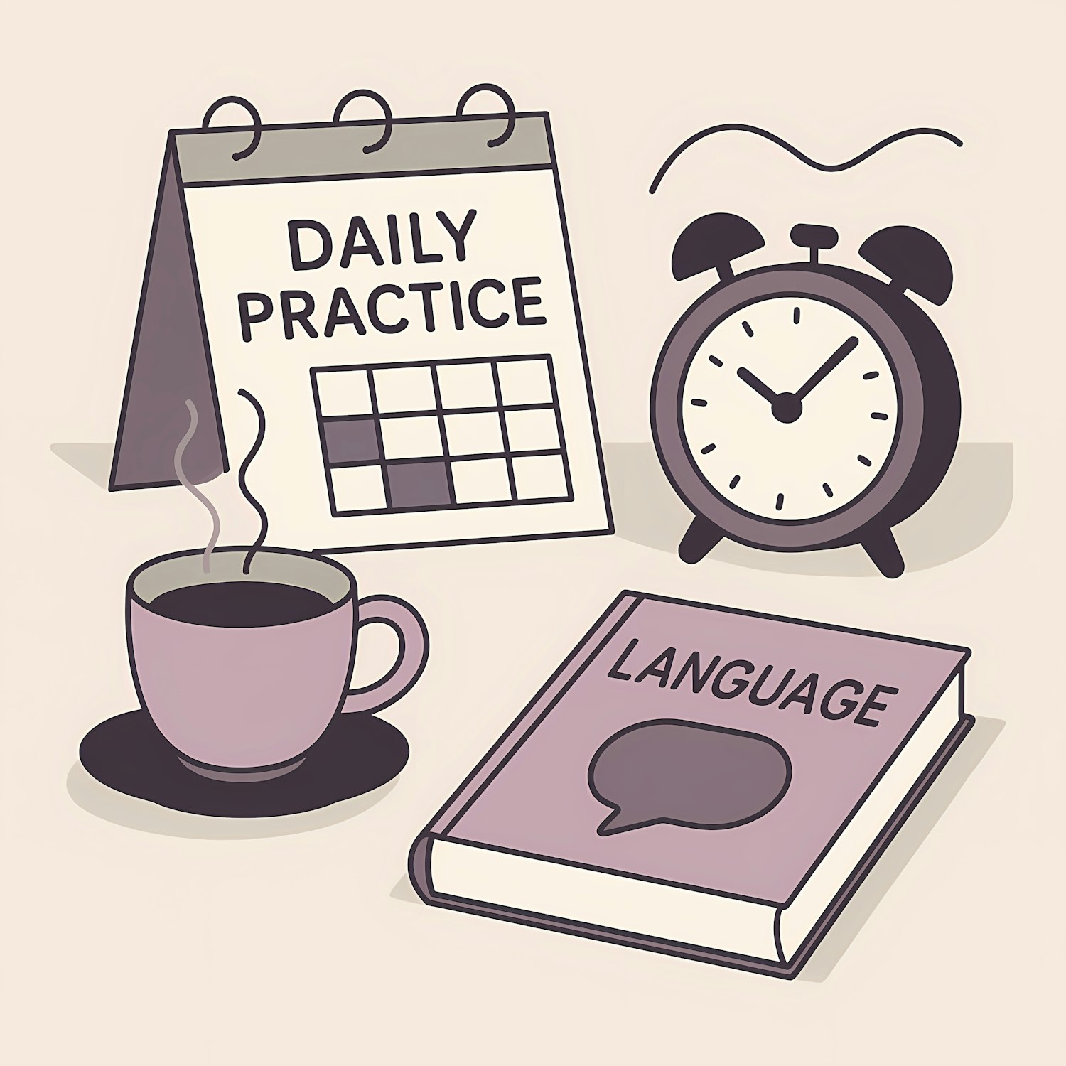 Minimalist illustration of a daily practice setup with a calendar, alarm clock, coffee, and language book in soft pastel tones.