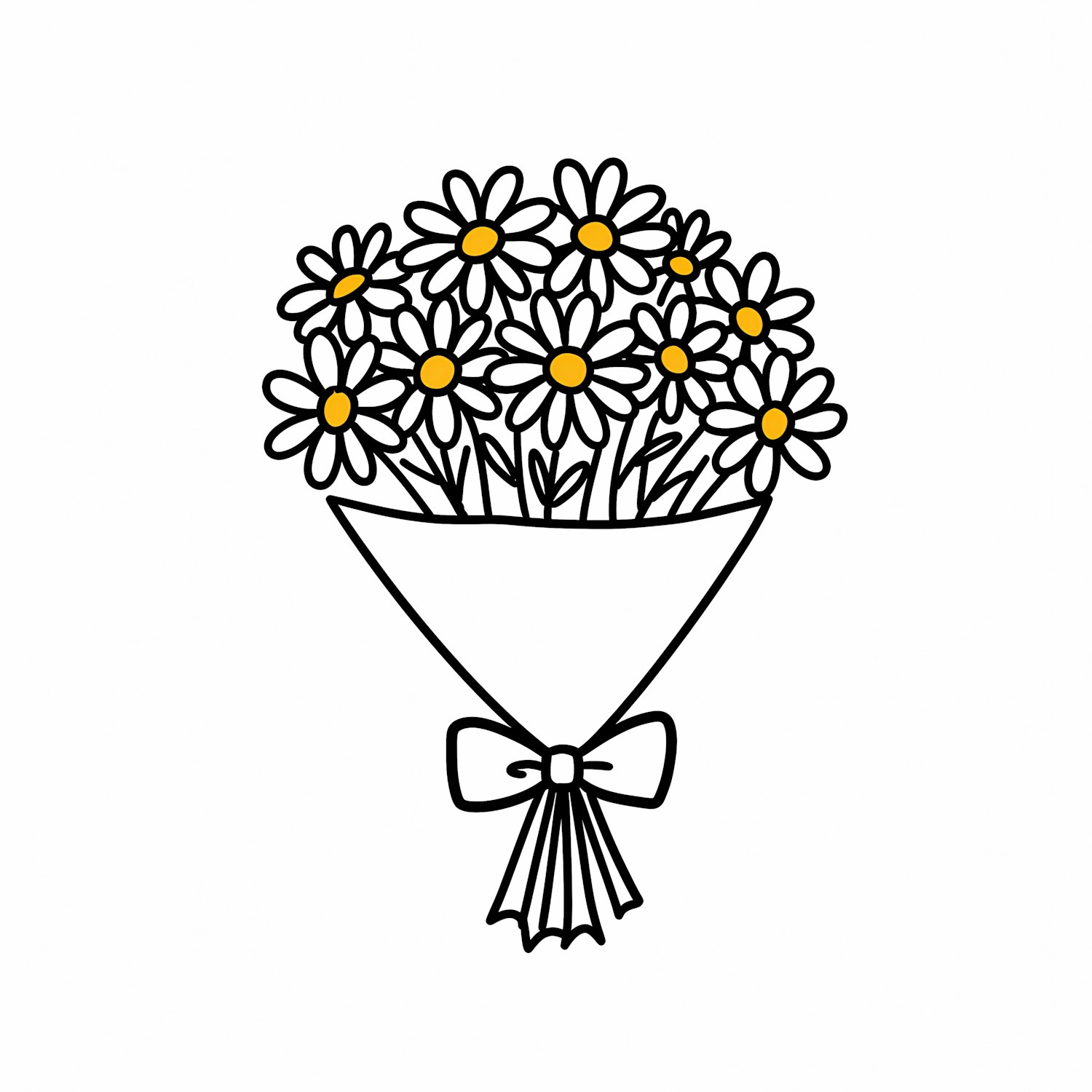 A minimalistic illustration of a daisy bouquet with white petals and yellow centers, wrapped in a cone with a bow, on a white background.