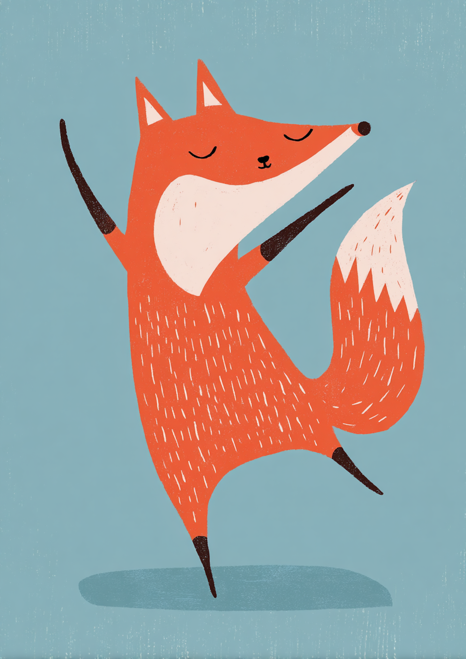 A playful illustration of a dancing red fox with a light blue background, perfect for kids' decor or whimsical designs.