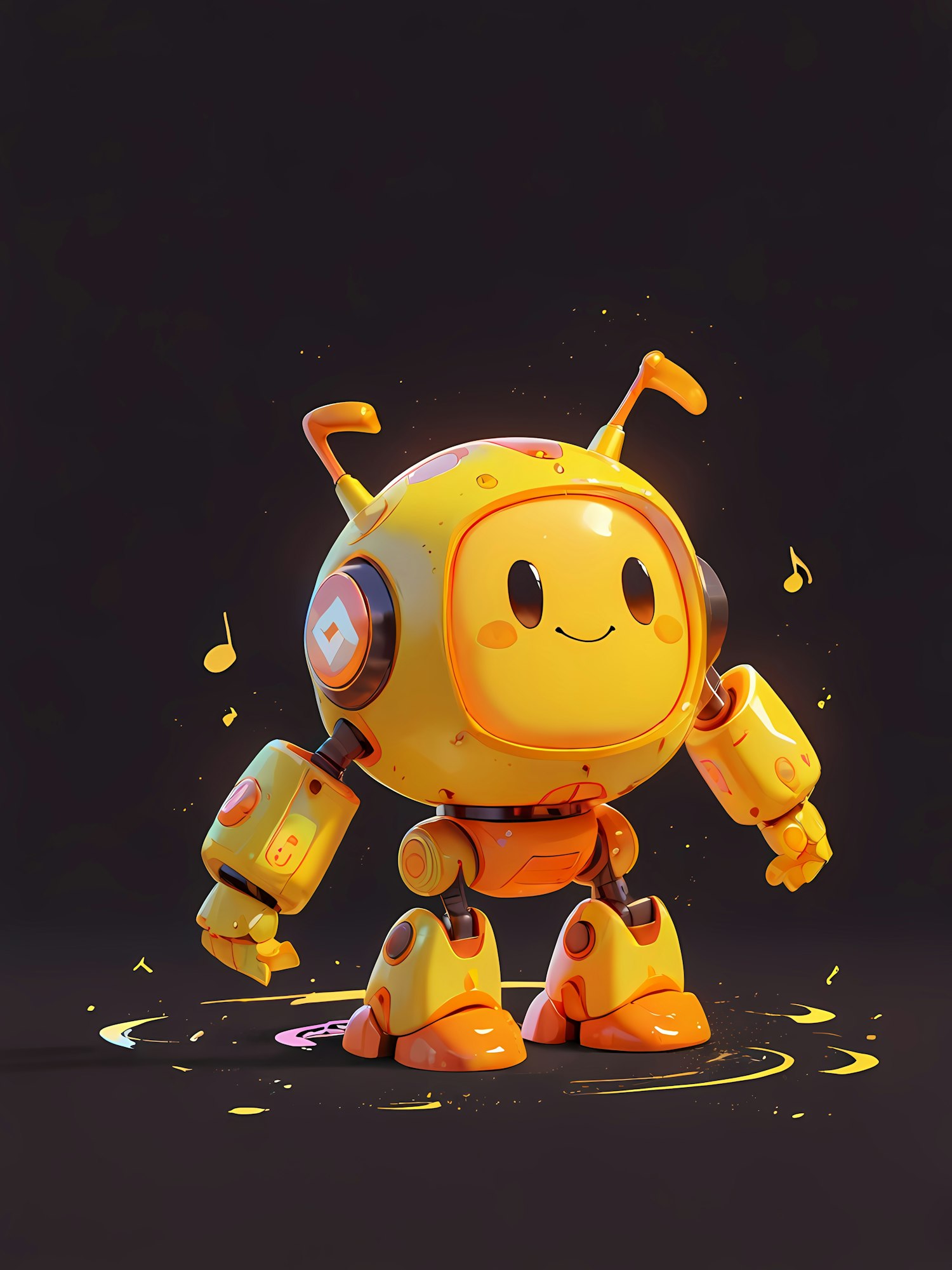 Adorable yellow robot with a smiling face, glowing accents, and musical notes, dancing on a colorful illuminated floor.