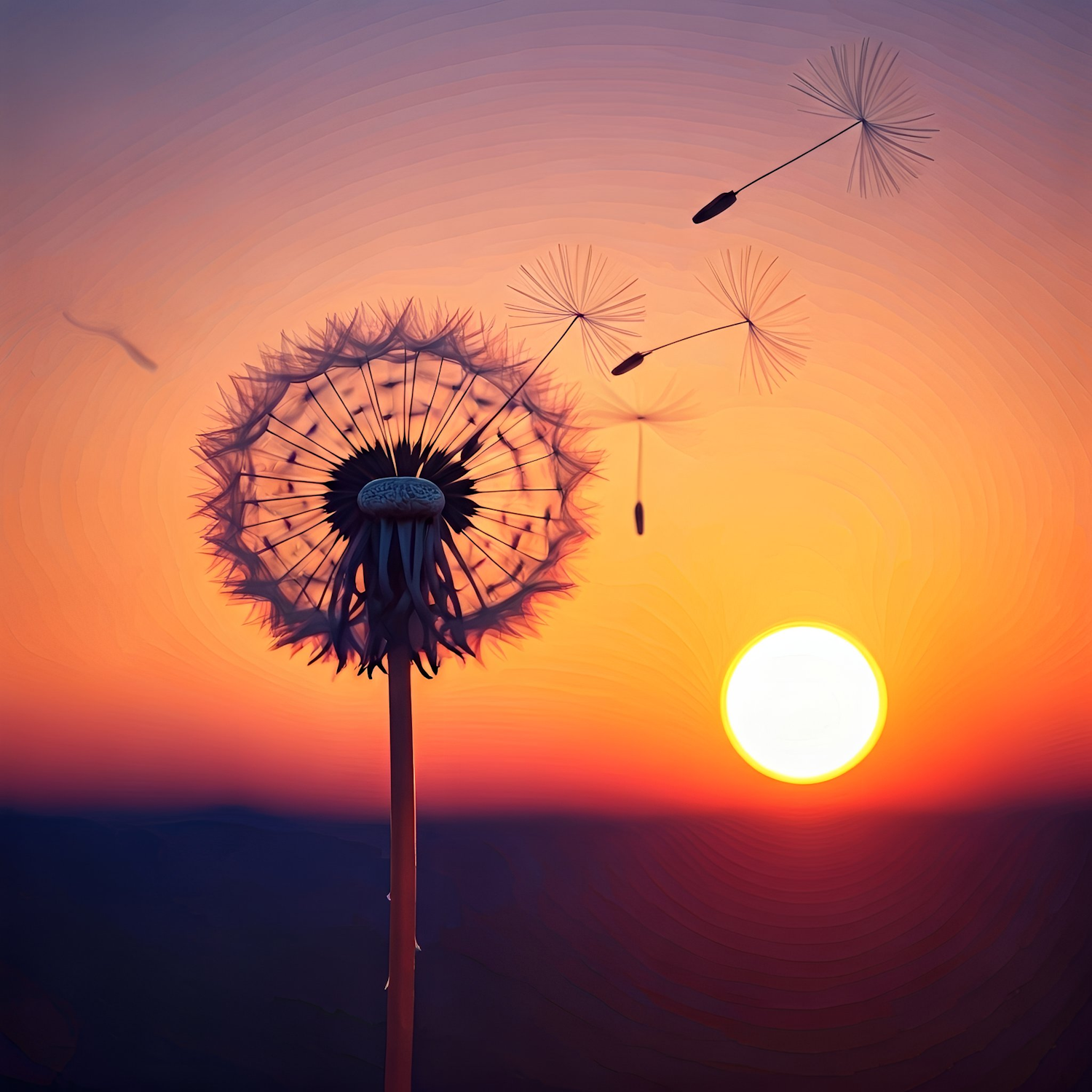 A dandelion releasing its seeds into the wind at sunset, with a vibrant orange and purple sky and the sun low on the horizon.