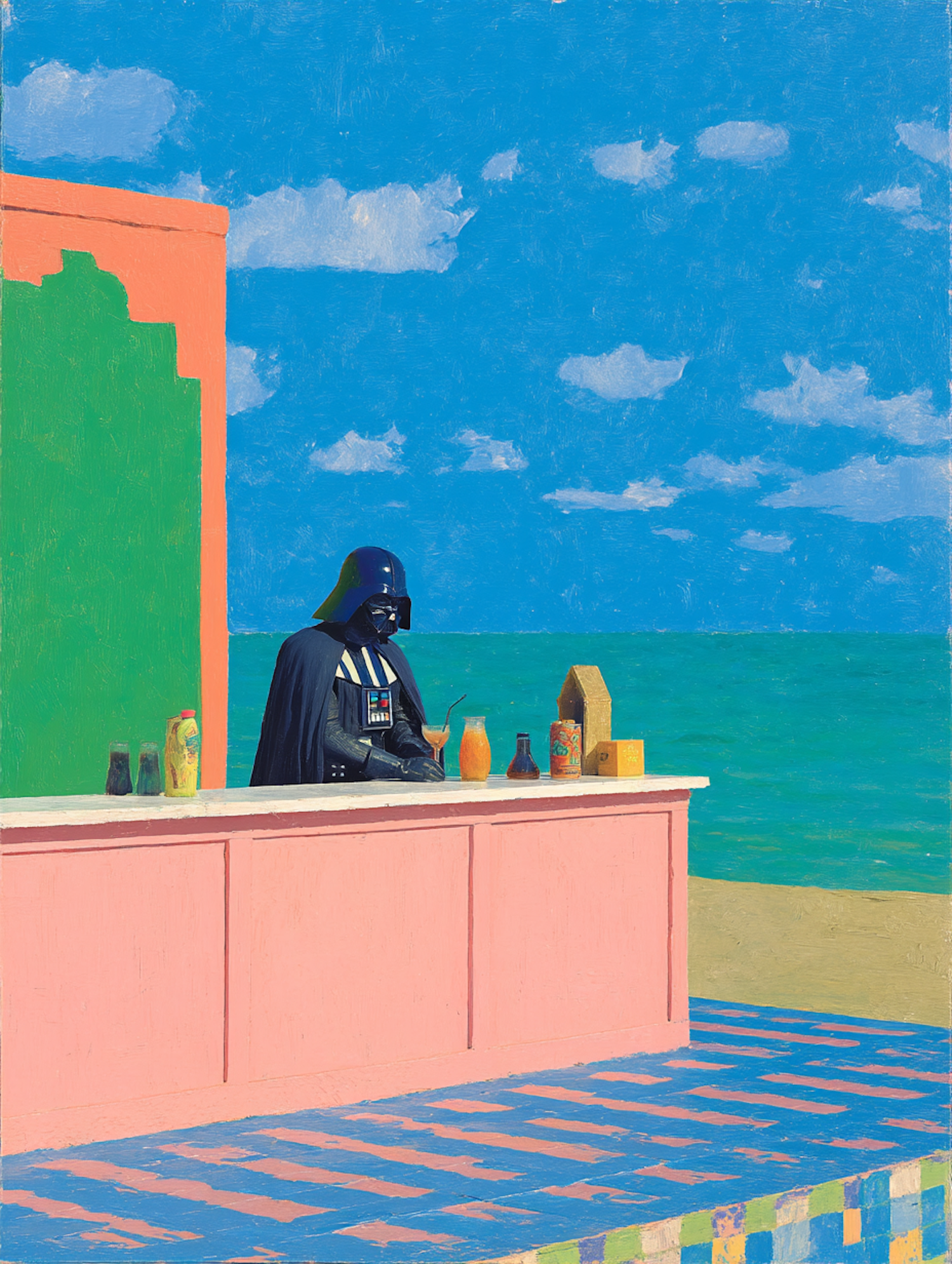 Darth Vader stands behind a pastel pink bar on a sunny beach, surrounded by colorful bottles and a vibrant tropical backdrop.