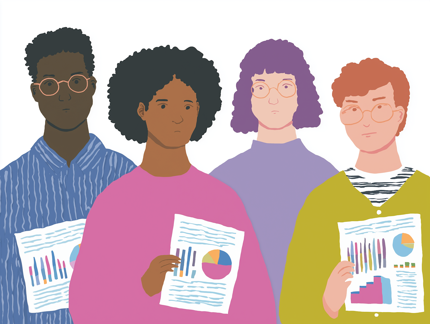 Illustration of four diverse individuals holding papers with colorful graphs, emphasizing teamwork and data analysis.
