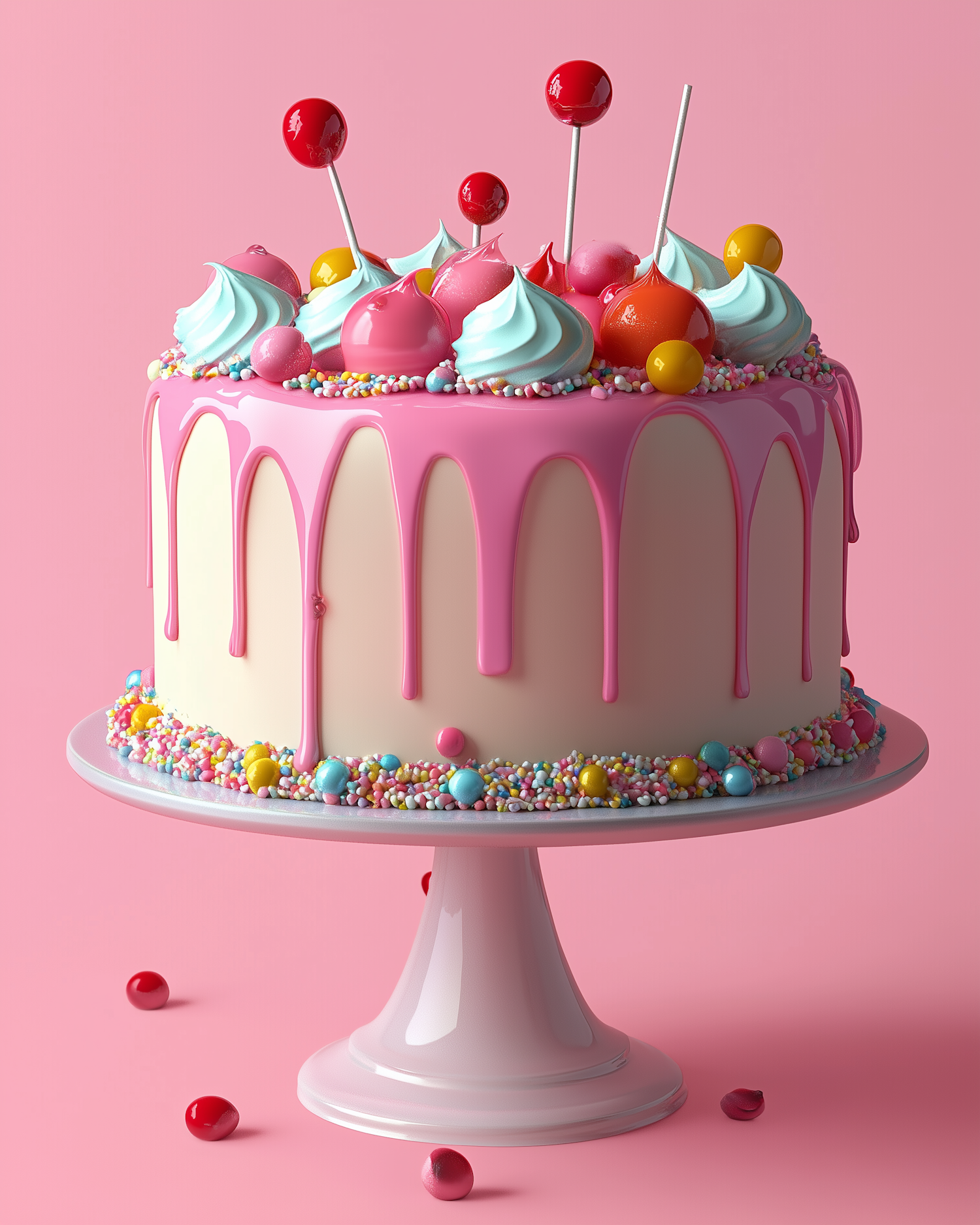 Whimsical cake with pink icing, colorful lollipops, and candy beads on a white pedestal against a pink background.