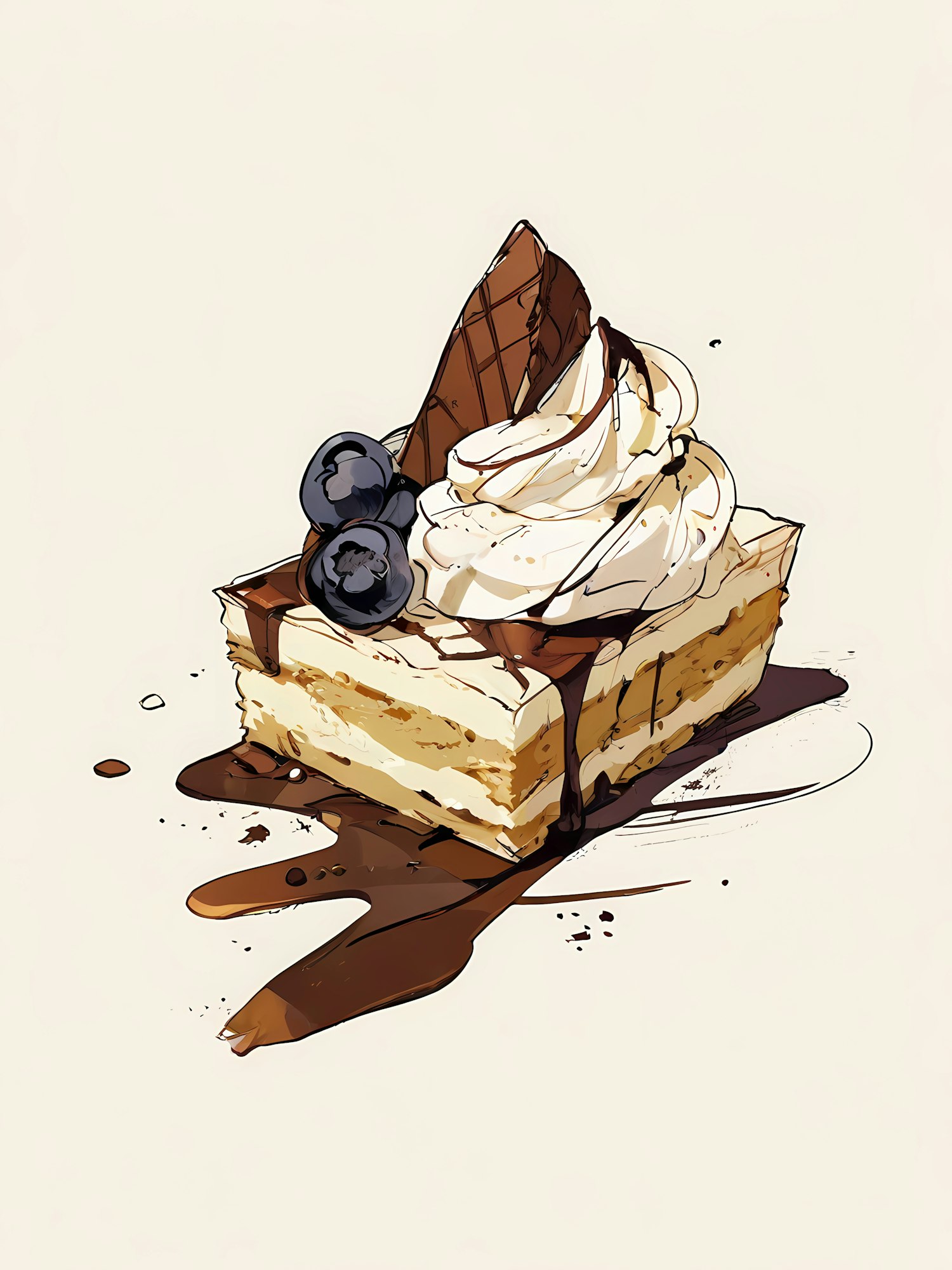 Illustration of a layered cake slice with whipped cream, chocolate drizzle, and blueberries on a light beige background.