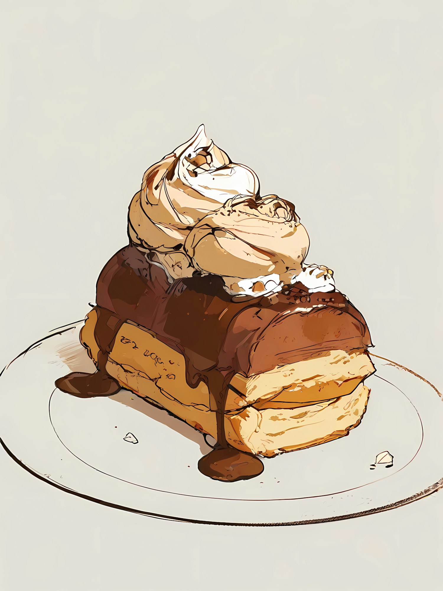 Illustration of a cream-filled pastry with chocolate sauce and whipped cream on a white plate.