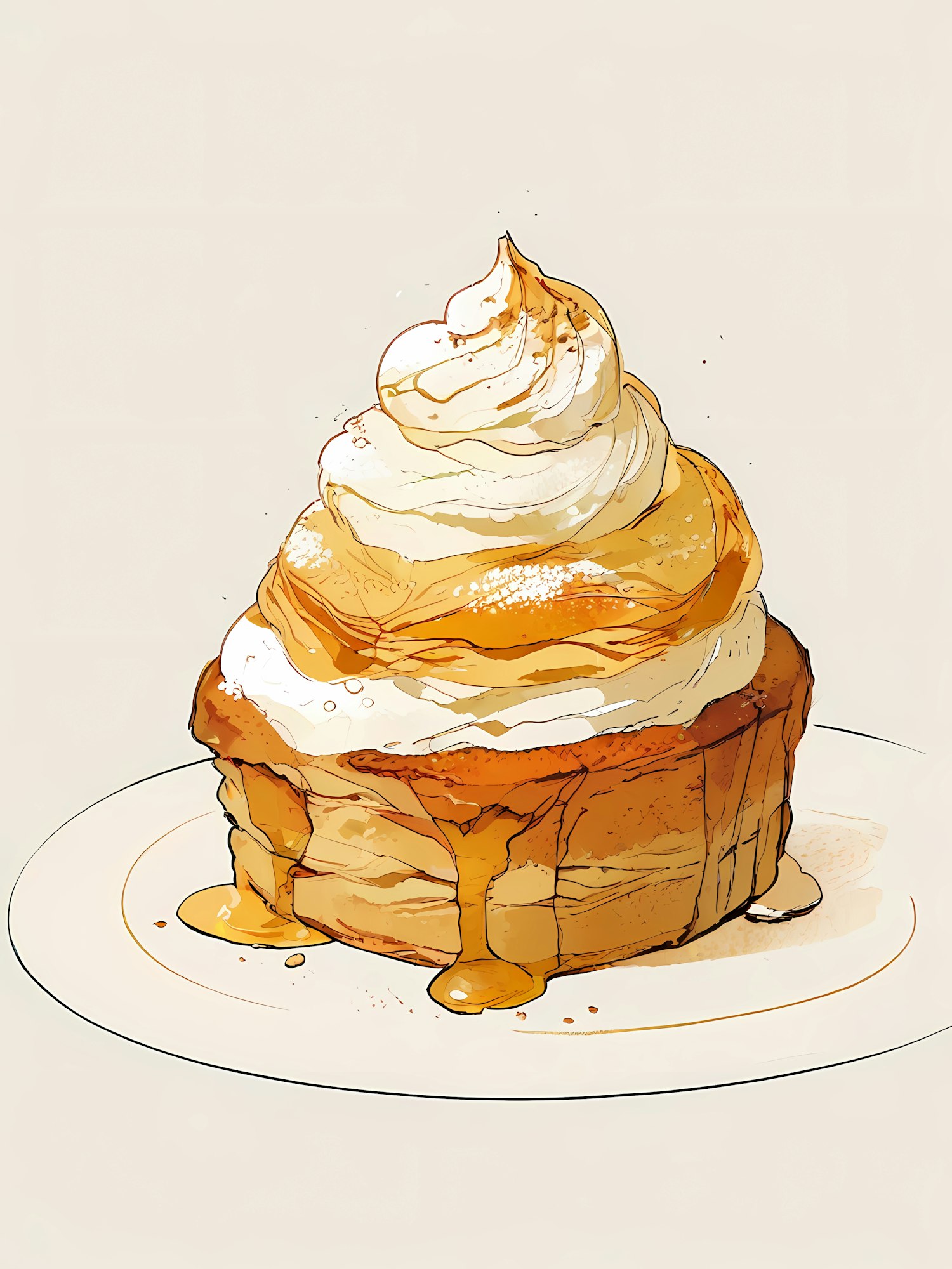 Illustration of a delicious toast dessert with whipped cream and syrup, showcasing rich textures and warm colors.