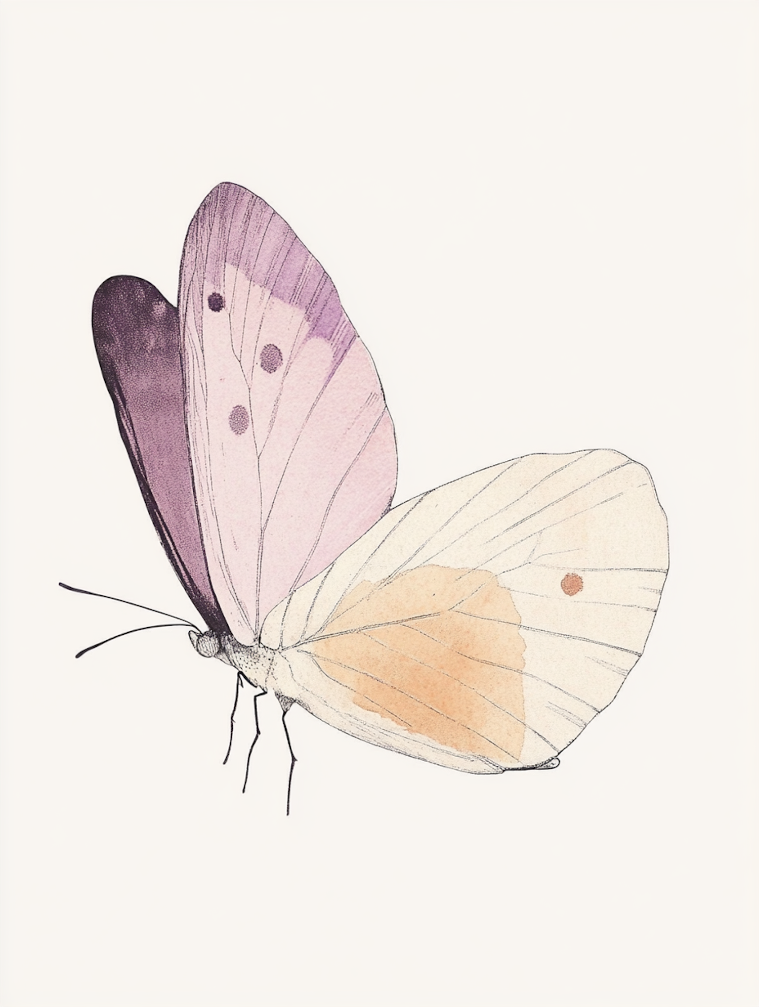 Elegant butterfly illustration with purple and cream wings, showcasing minimalist design and delicate details on a light background.