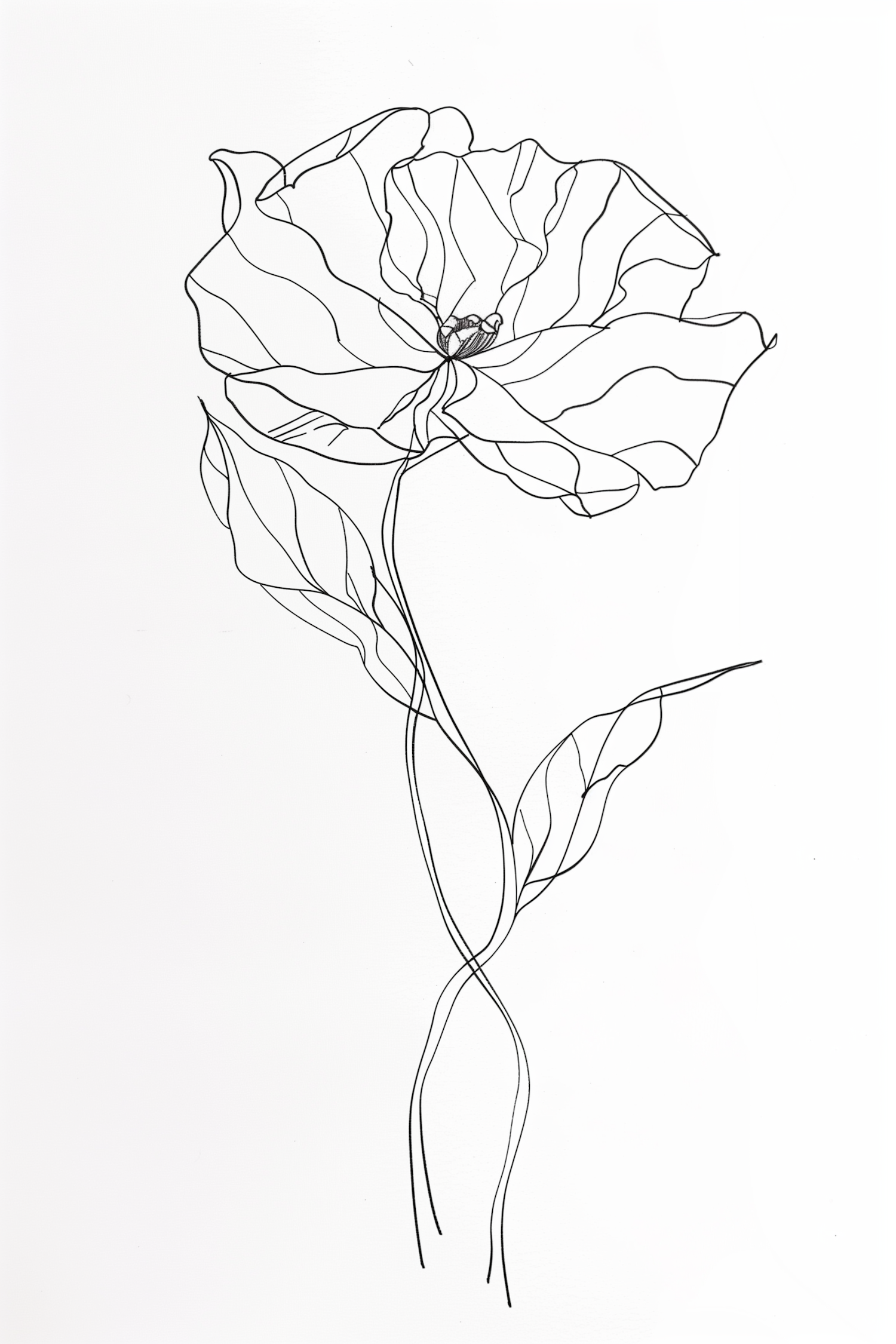 Elegant minimalist line drawing of a flower with flowing petals and slender stem on a white background.