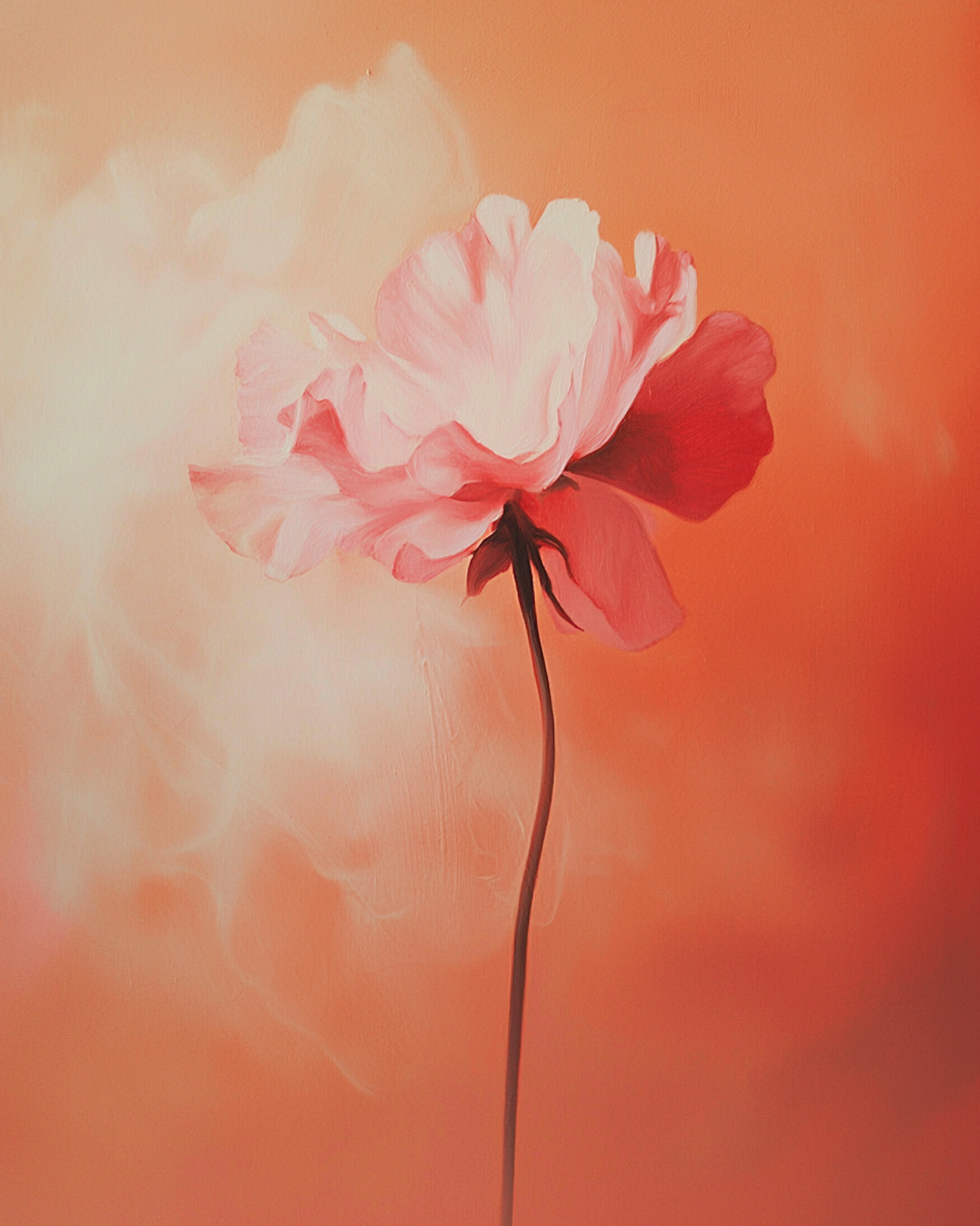 A soft pink flower with ruffled petals stands against a dreamy orange gradient background, creating a serene and ethereal vibe.