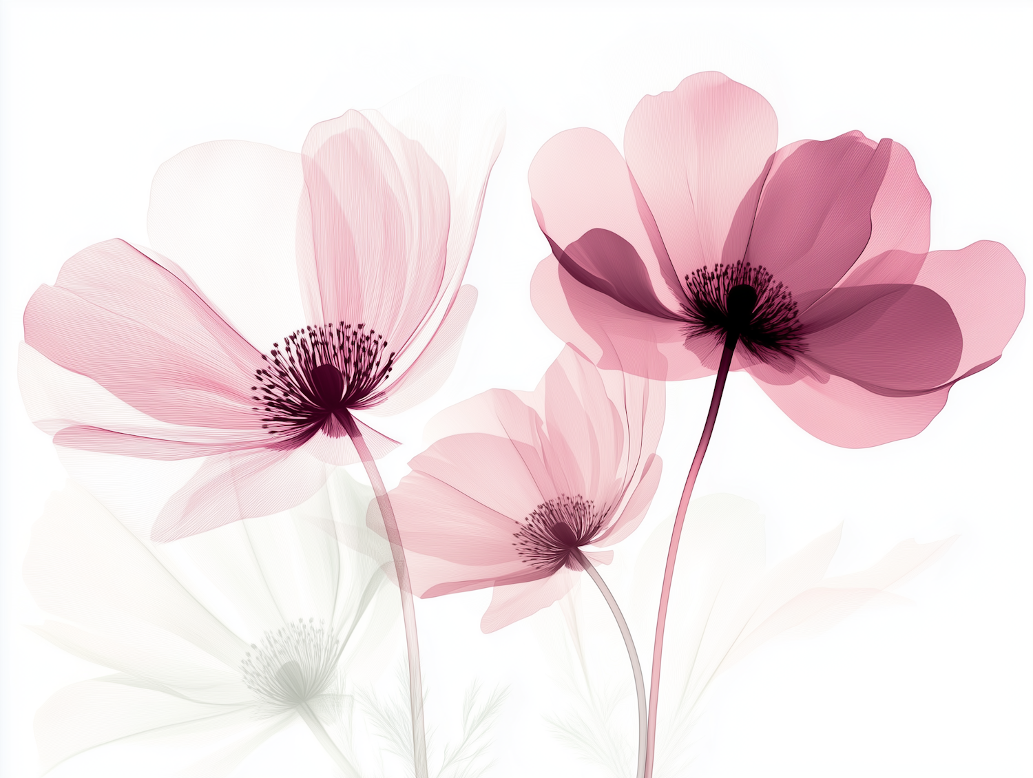Soft pink translucent flowers with intricate details on a white background, creating a minimalistic and ethereal floral composition.
