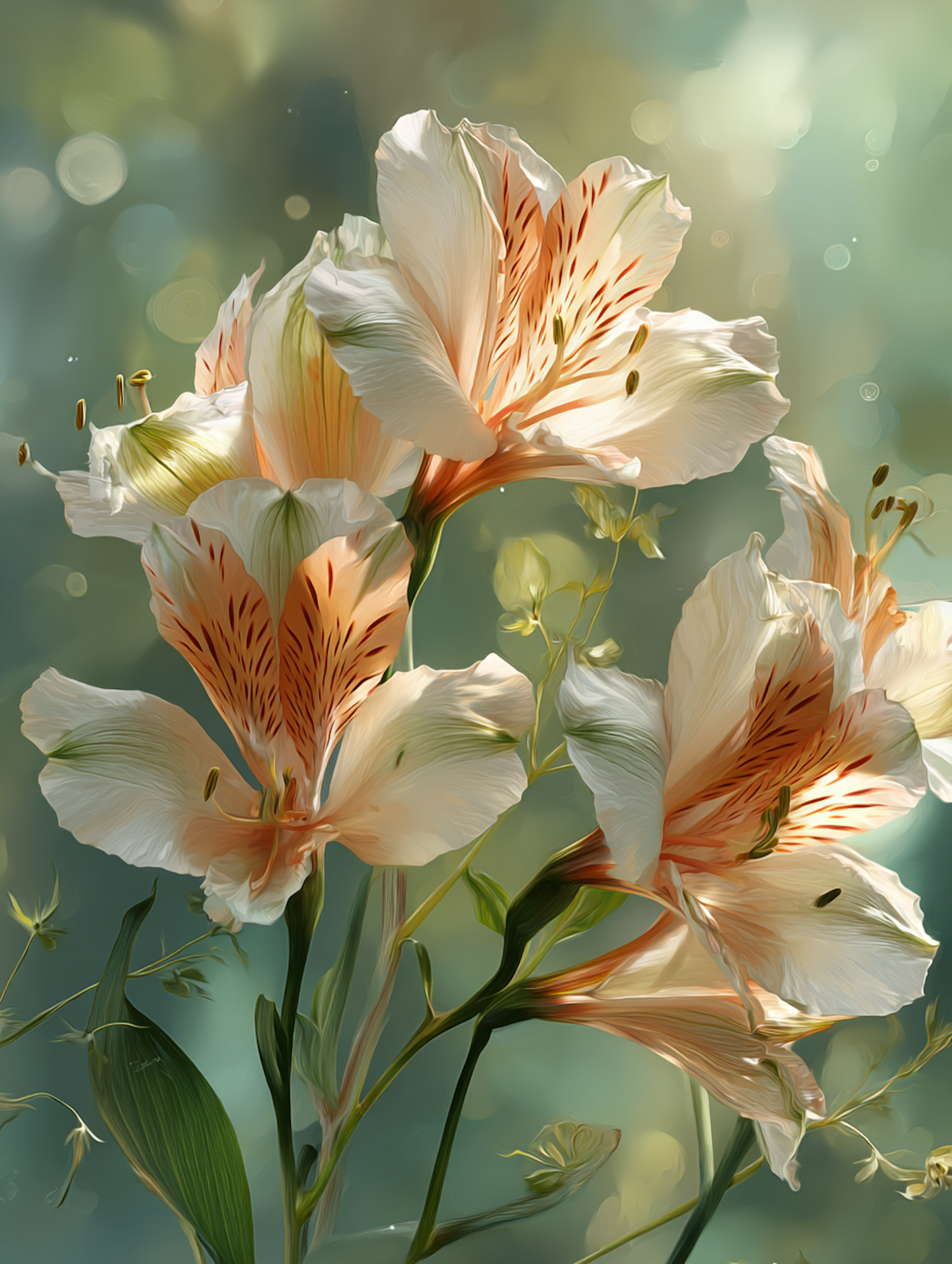 Close-up of blooming white lilies with orange accents, set against a soft green bokeh background, highlighting their delicate beauty.