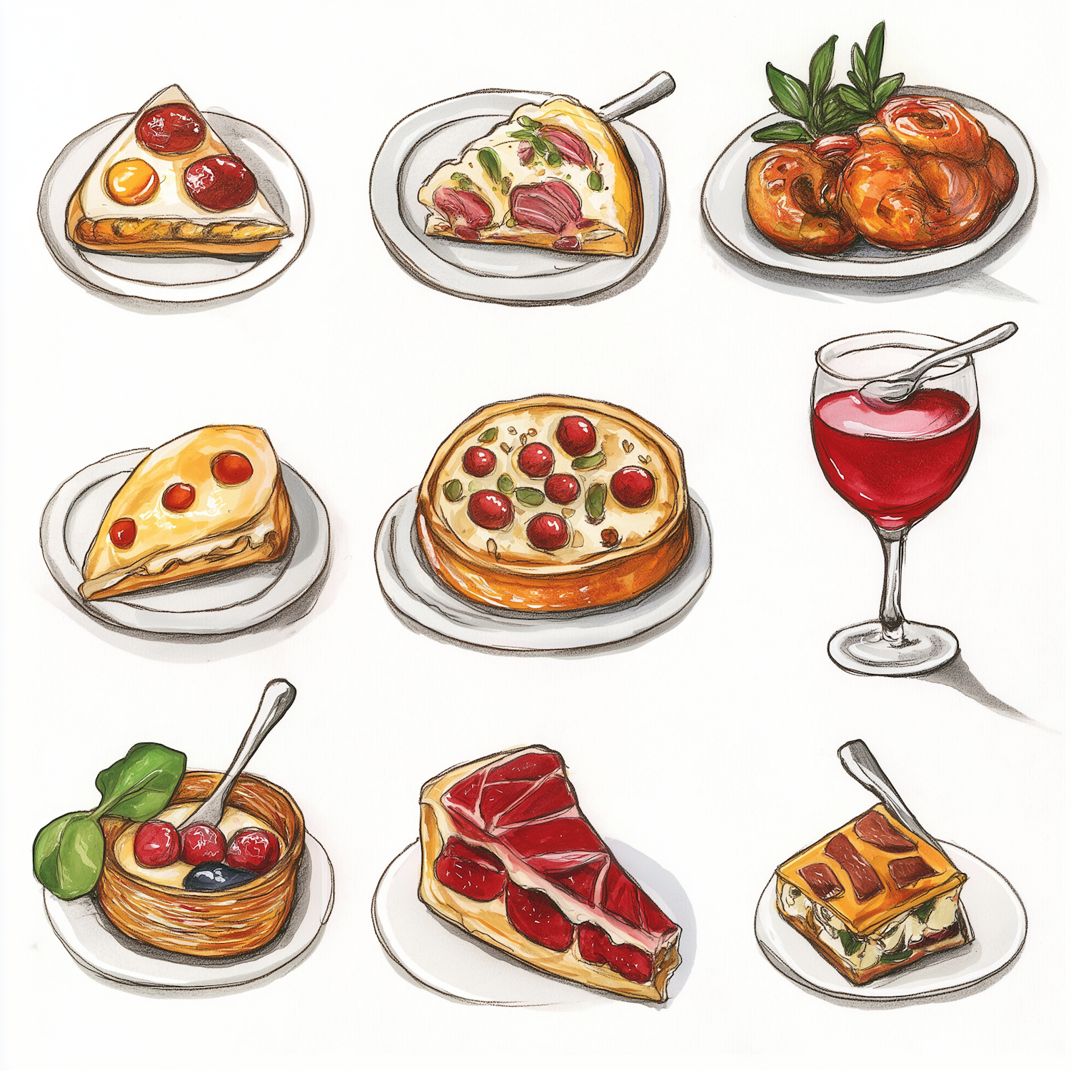 Illustration of savory and sweet dishes, including quiches, pastries, pizza, and a glass of wine, all beautifully plated.