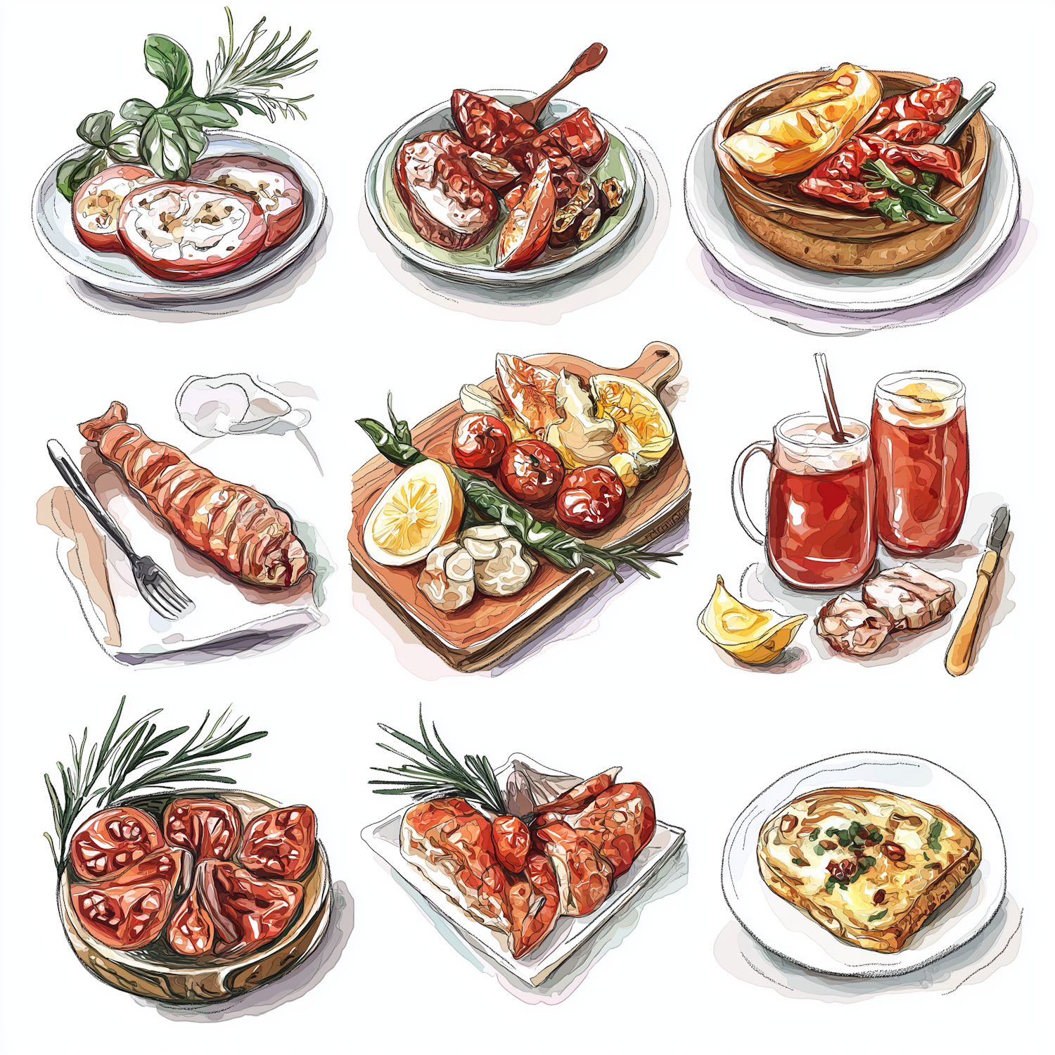 A colorful illustration of gourmet dishes, from seafood to cocktails, perfect for food lovers and culinary inspiration.