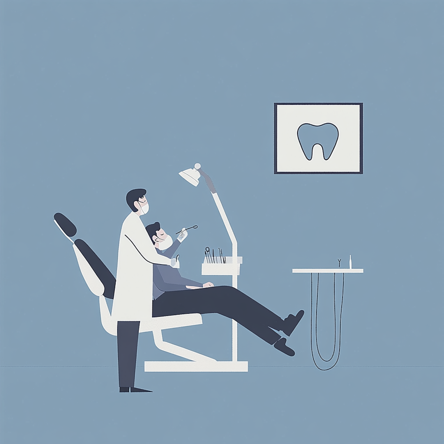 Minimalist illustration of a dentist treating a patient in a clean, modern clinic with a light blue background and dental tools visible.