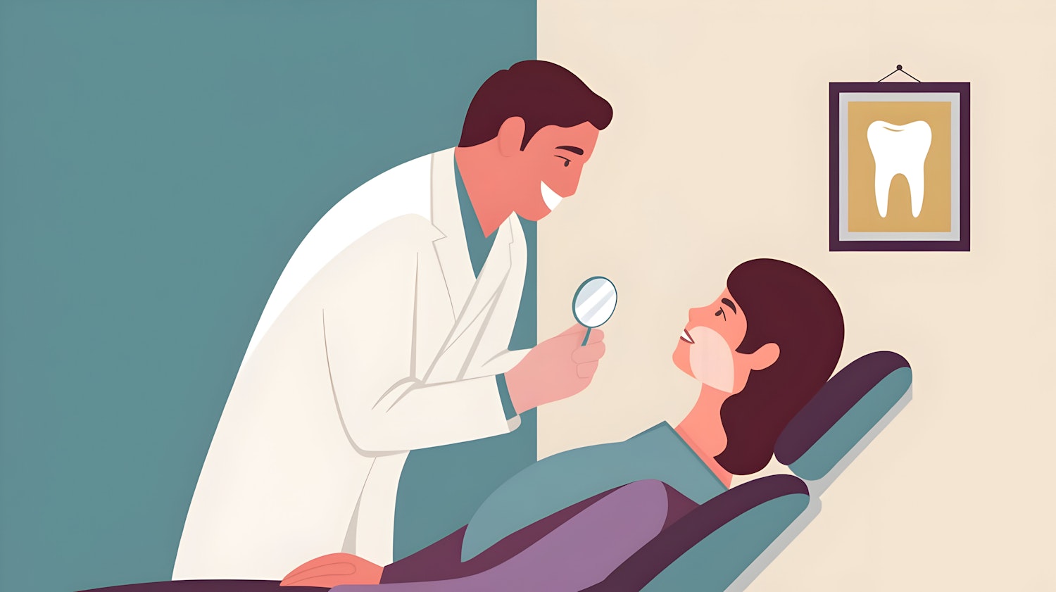 Illustration of a dentist examining a patient in a calm, friendly clinic setting with a tooth poster on the wall.