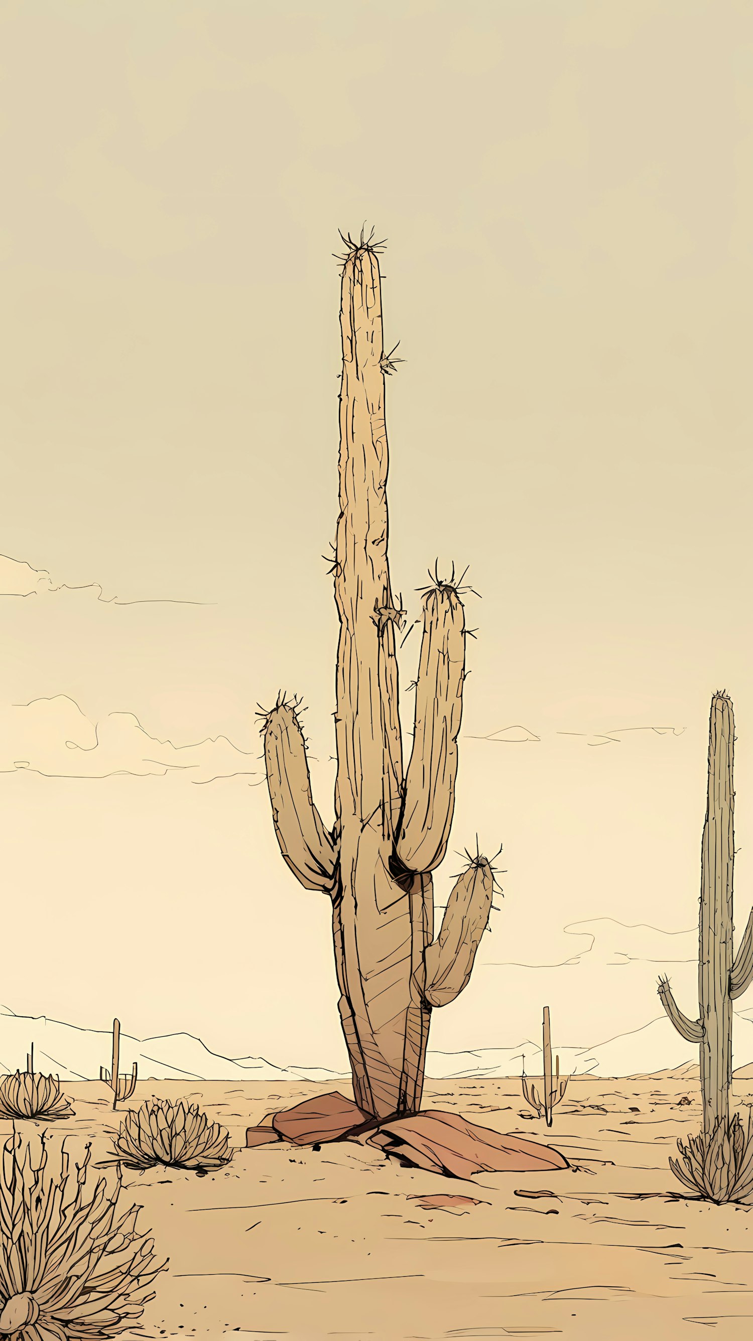 A serene illustration of a central saguaro cactus in a minimal desert setting with soft tones and a clear sky. Perfect for nature art.