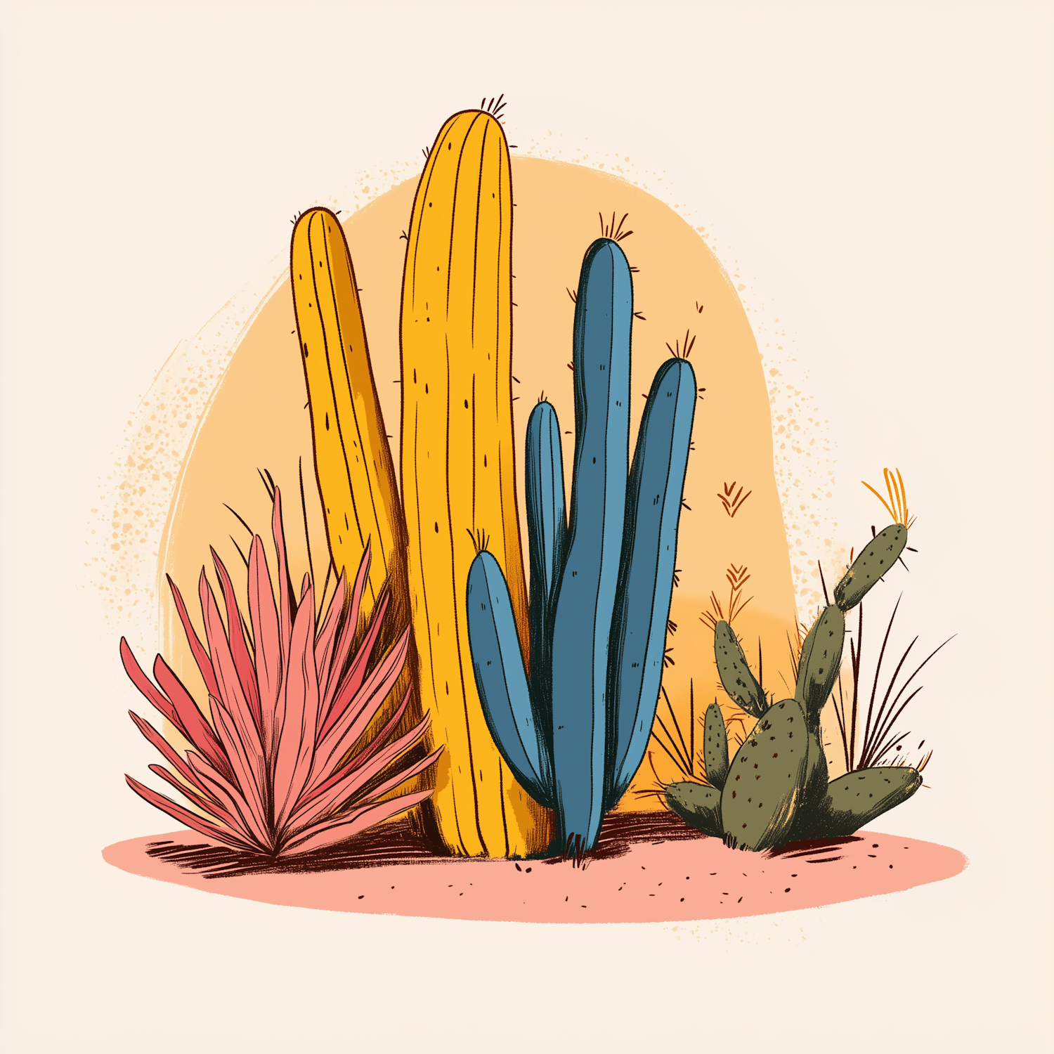 Colorful illustration of diverse cacti and succulents in a desert setting, featuring yellow, blue, pink, and green hues.