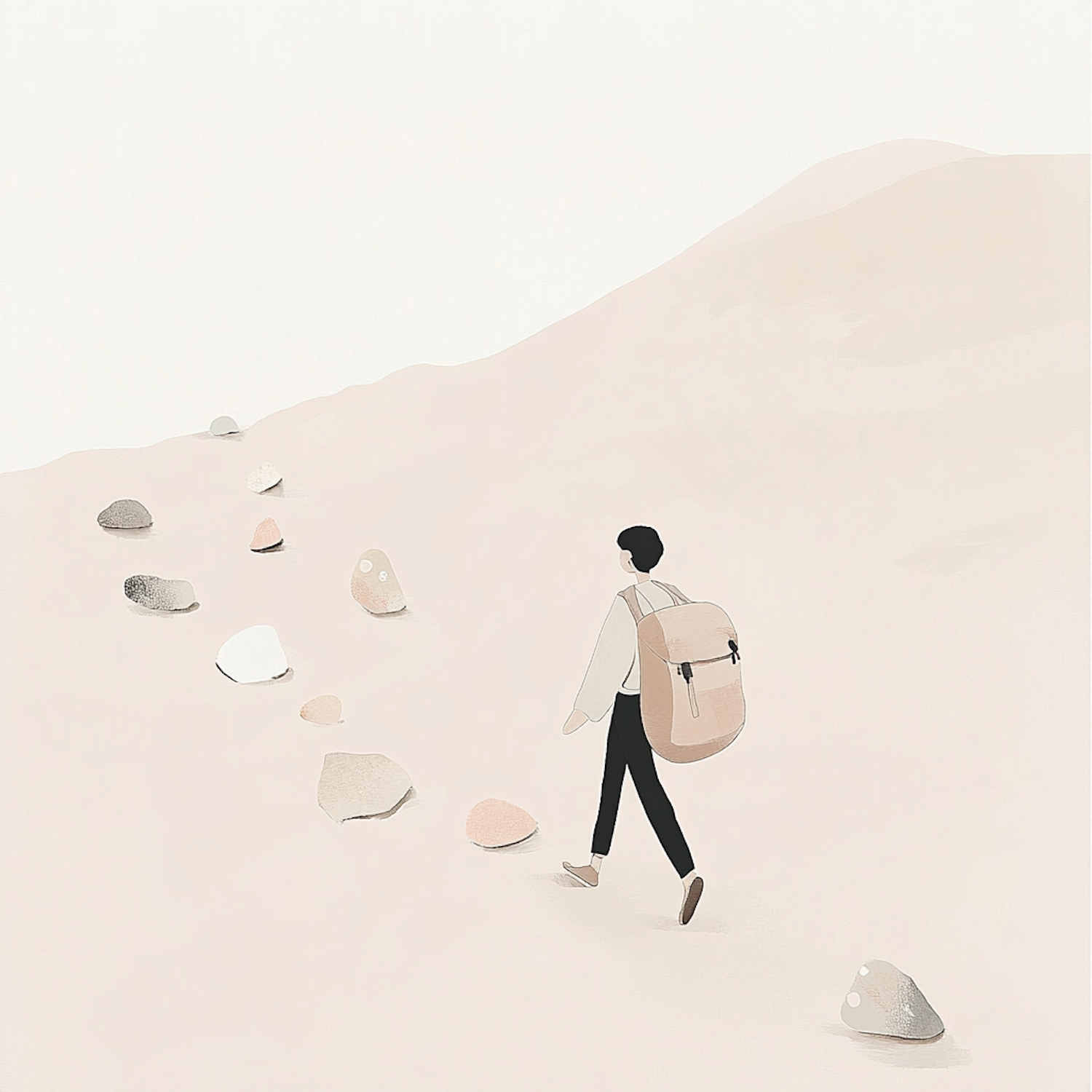 Minimalist illustration of a person with a backpack walking through a serene, sandy landscape with scattered rocks.