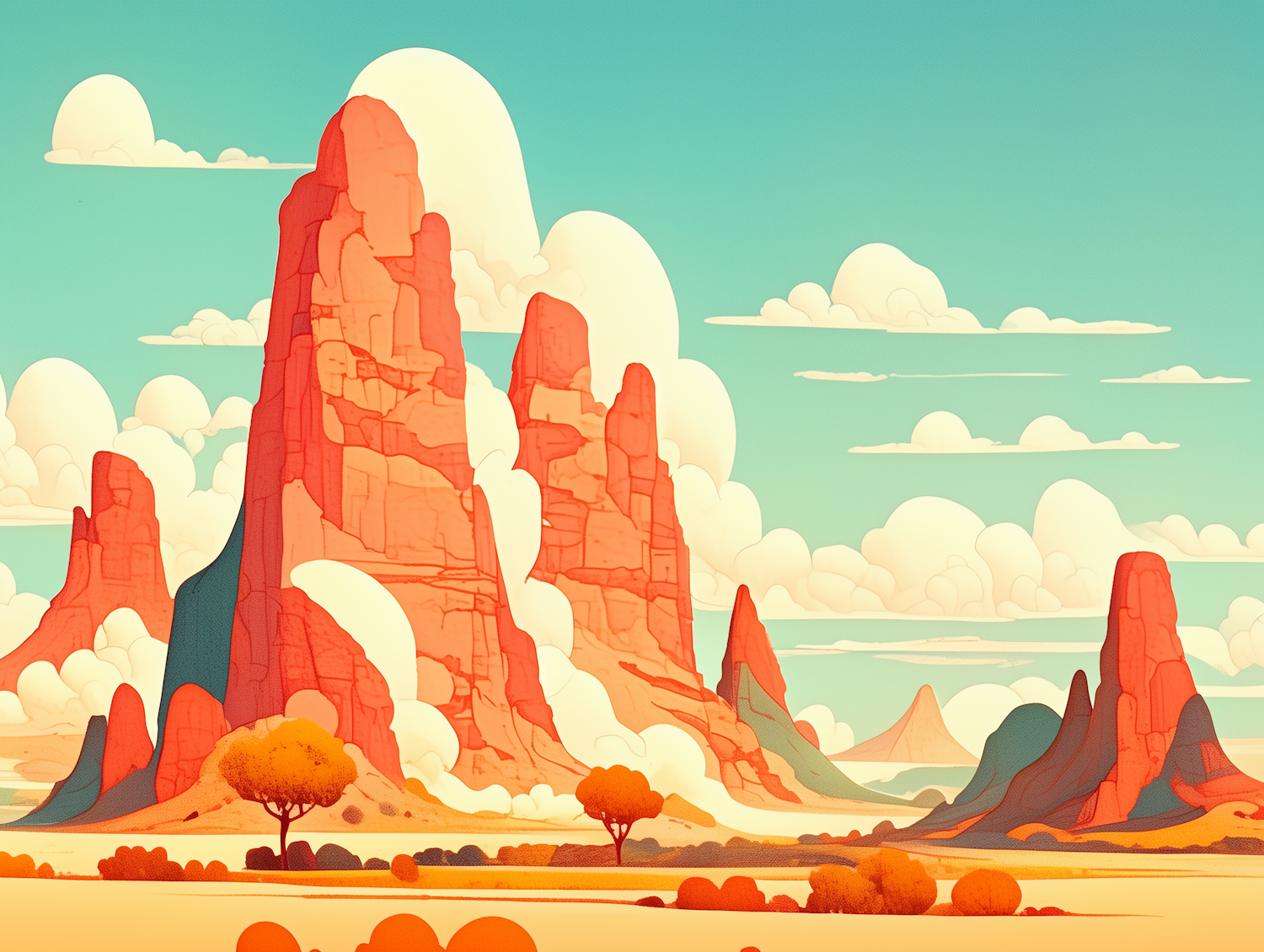 Vibrant desert landscape illustration with towering red rock formations, fluffy clouds, and sparse orange vegetation under a blue sky.