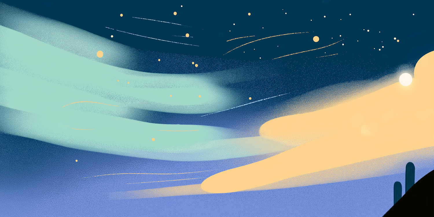 Illustration of a whimsical desert night sky, featuring gradients, stars, and cacti silhouettes against a blending colored backdrop.