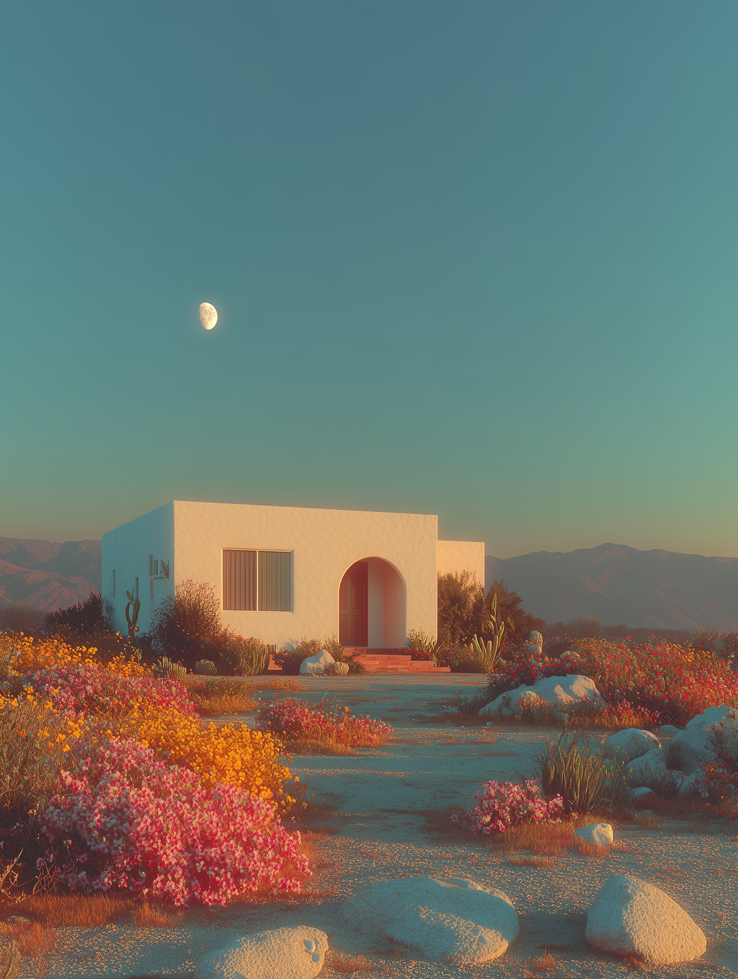 A white stucco house in a desert landscape, surrounded by vibrant wildflowers and rocks, under a clear sky with the moon visible.
