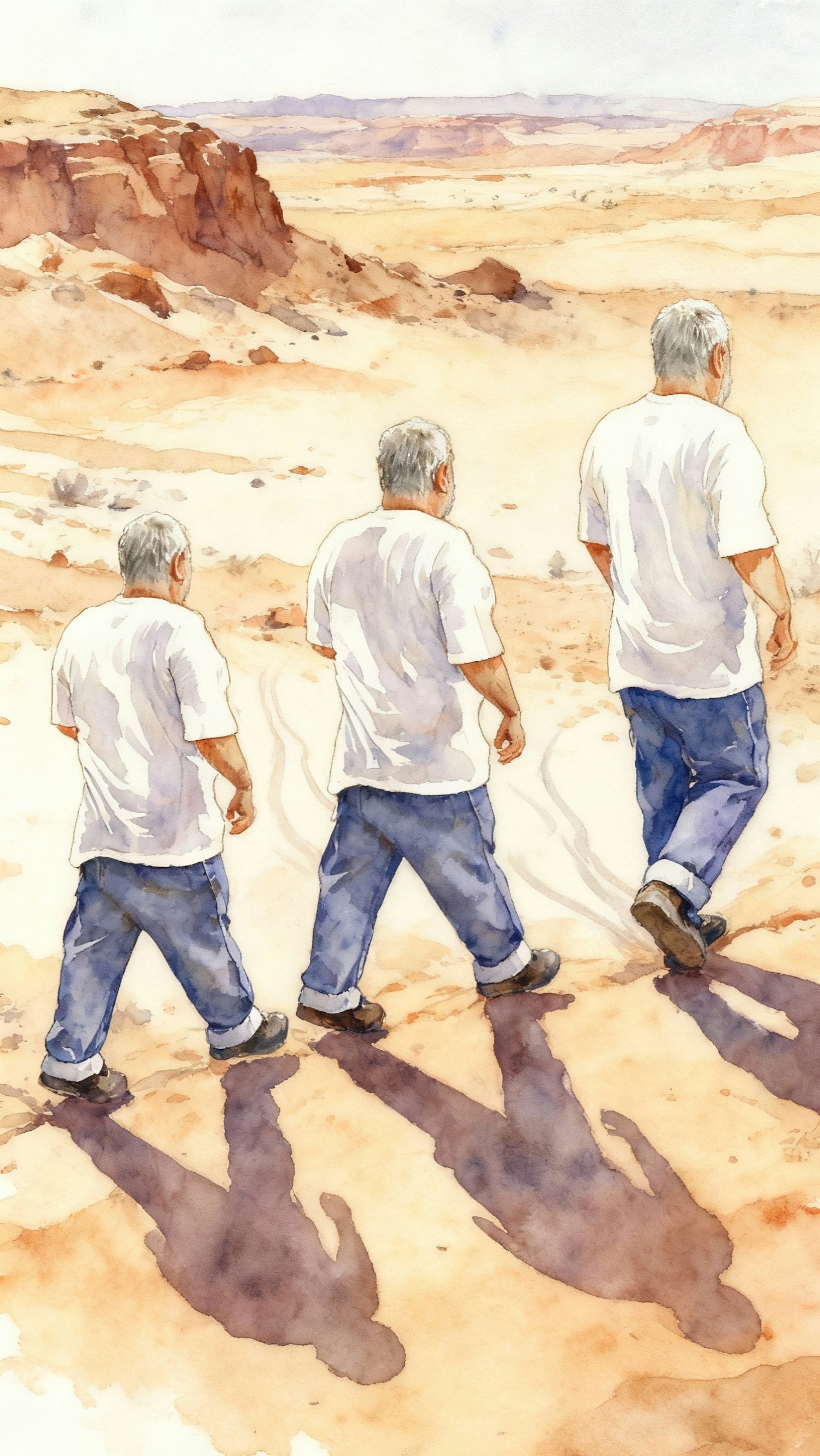 A watercolor-style illustration of a man walking in a desert, depicted in three sequential positions, with shadows and a scenic background.