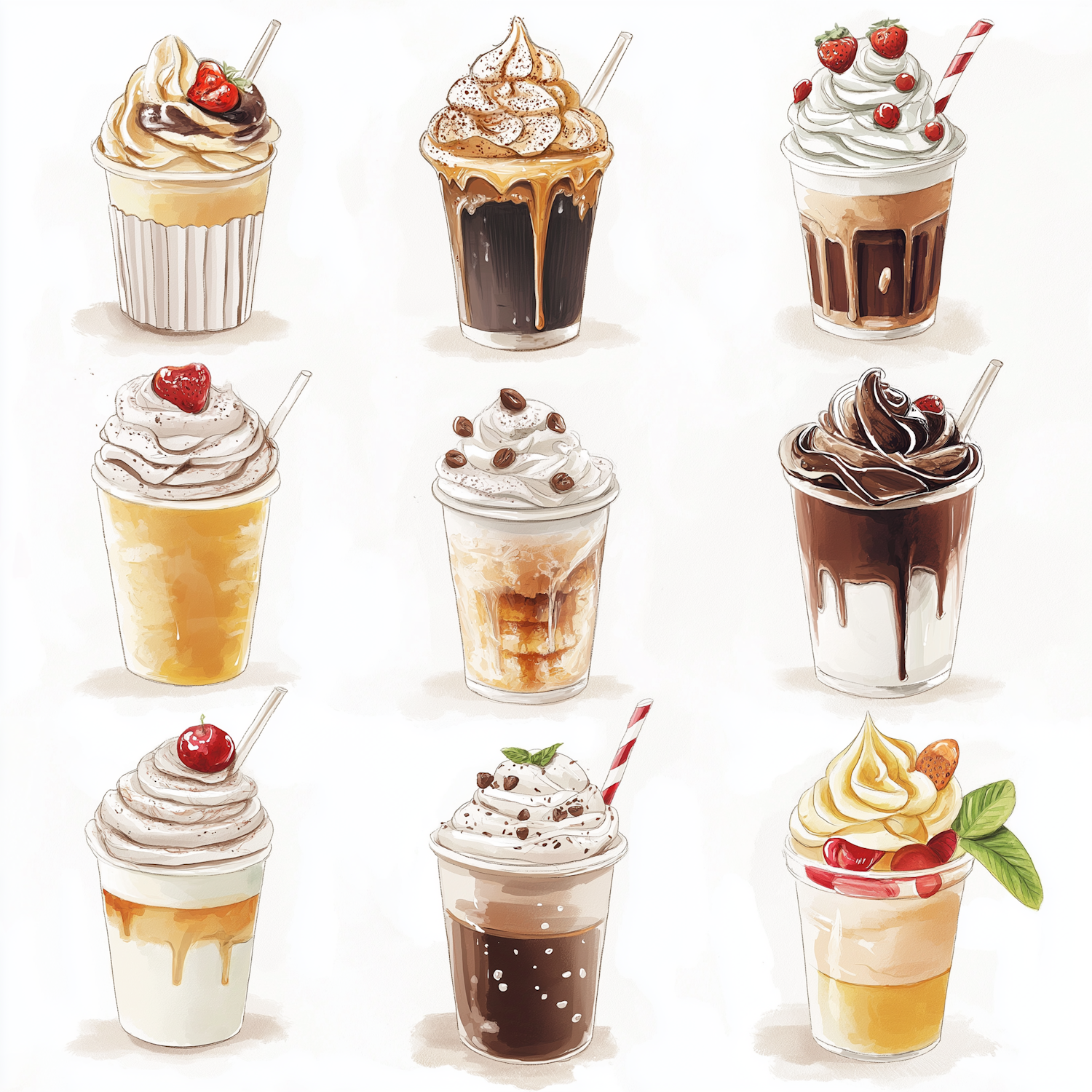 A delightful illustration of nine dessert drinks, featuring whipped cream, syrups, and garnishes like strawberries, cherries, and mint.
