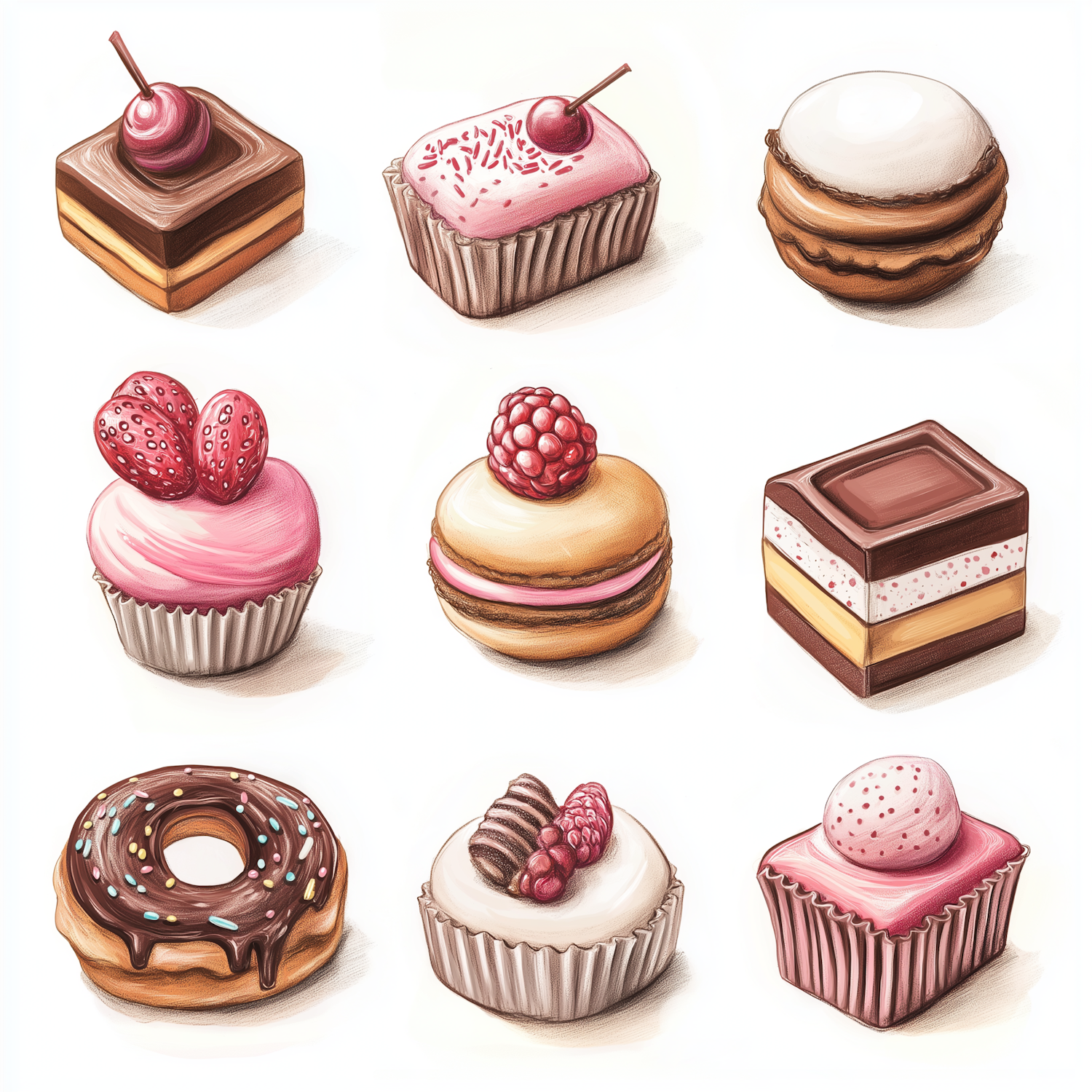 A charming illustration of nine colorful desserts, including cupcakes, macarons, and donuts, with intricate details and pastel tones.