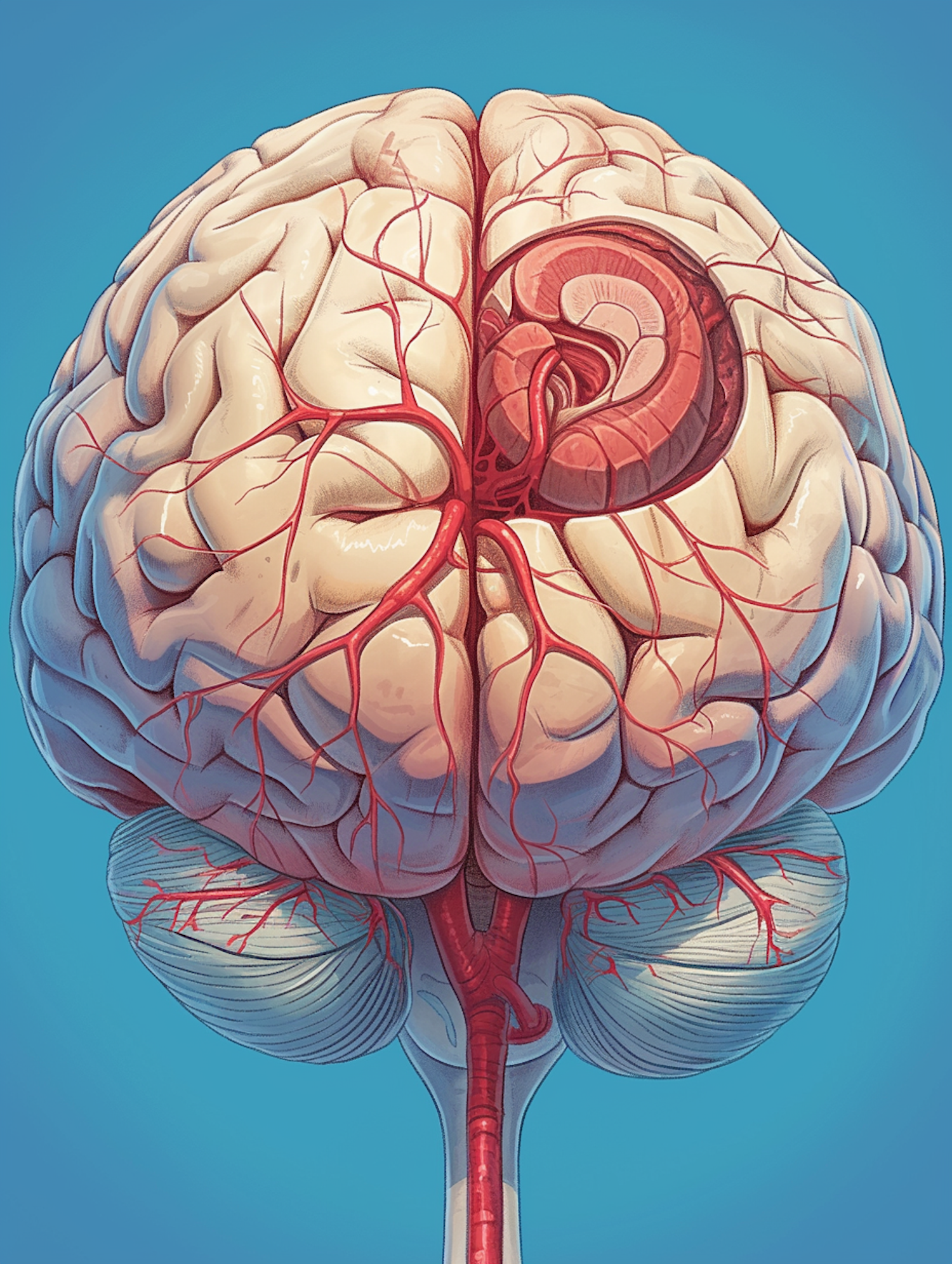 Detailed anatomical illustration of a human brain with vivid red blood vessels against a creamy white background.